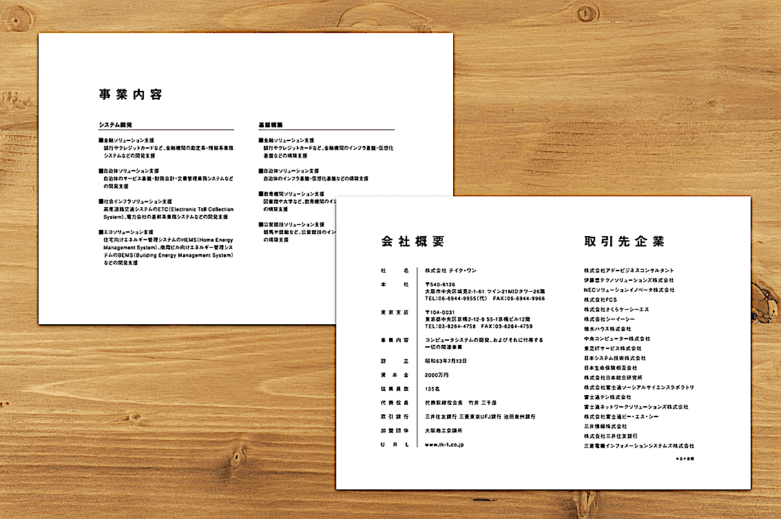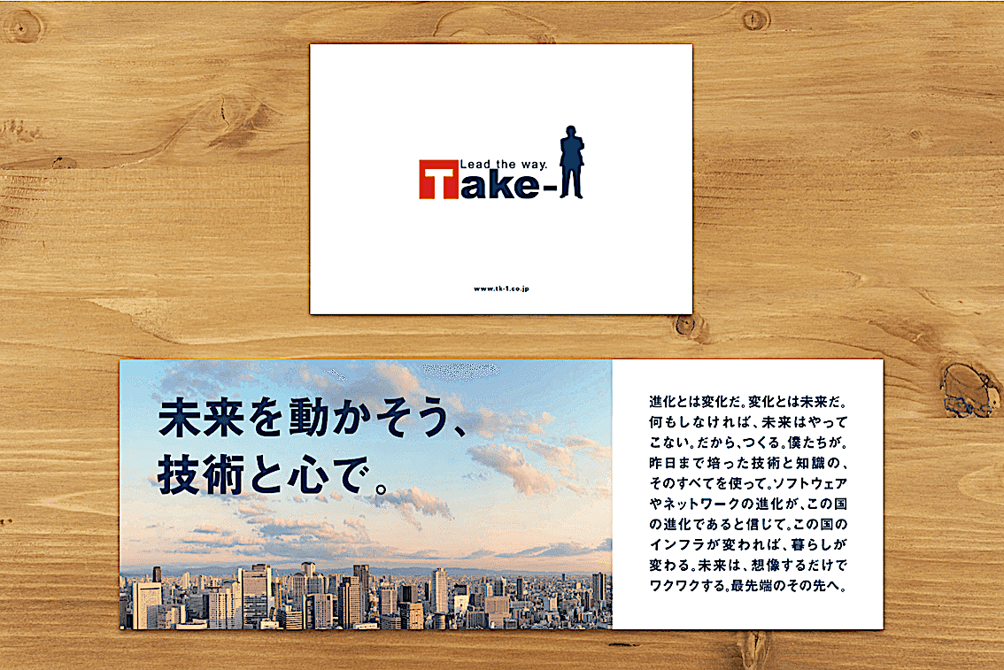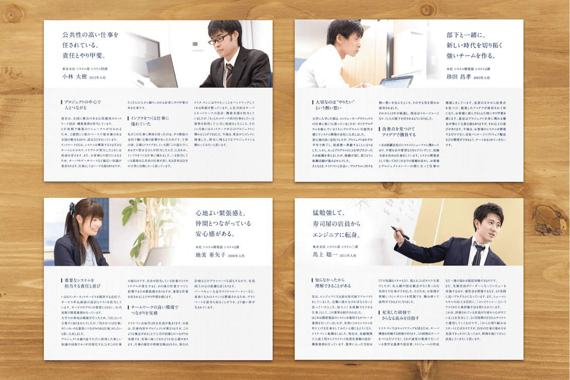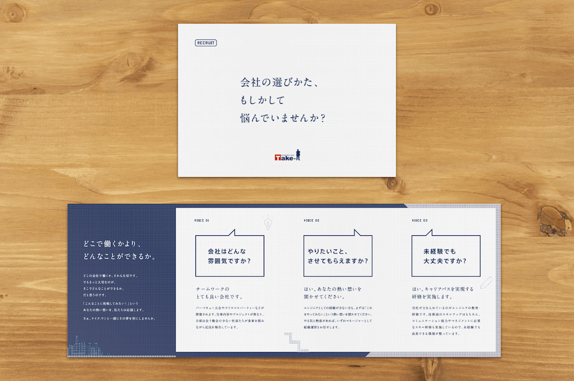 コンピュータシステムの設計・構築・保守・運用を行っているエンジニア集団、テイク・ワンの会社案内及び採用案内を制作しました。金融機関や自治体、交通システムといった社会インフラに特化していることから、インフラづくり携われることの魅力や醍醐味を、インタビュー形式のコンテンツで紹介しました。