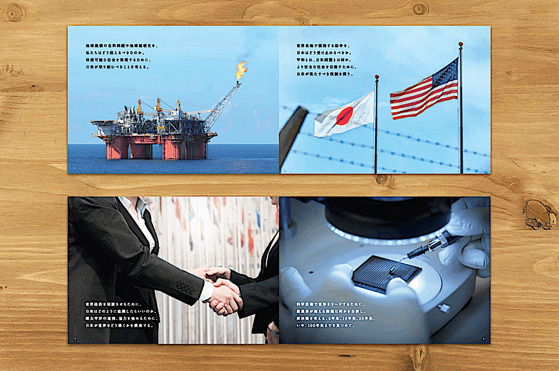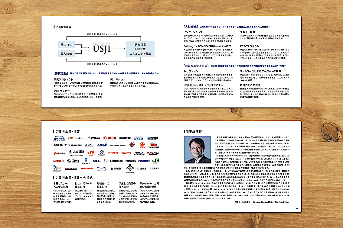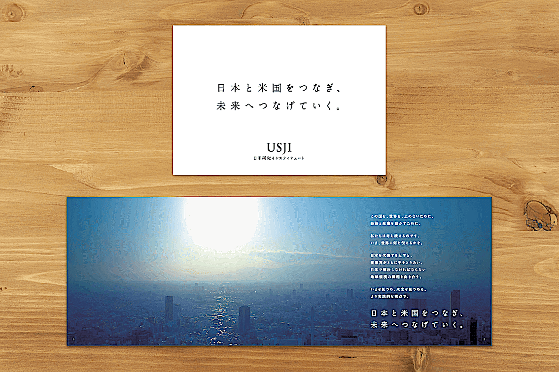 米国政治研究を中心に、イベント、コミュニティ形成、人材育成などの事業を行う、日米研究インスティテュート(USJI)のコンセプトブック制作実績です。USJIの認知を高め、多くの企業様への事業理解を促すとともに、組織活動に必要な寄付を募ることを目的にパンフレットデザインを進めて行きました。大切なのは、その思いがはっきりと伝わること。米国と日本の架け橋になる。存在意義を伝えるパンフレットに仕上げています。