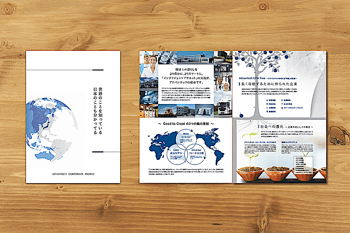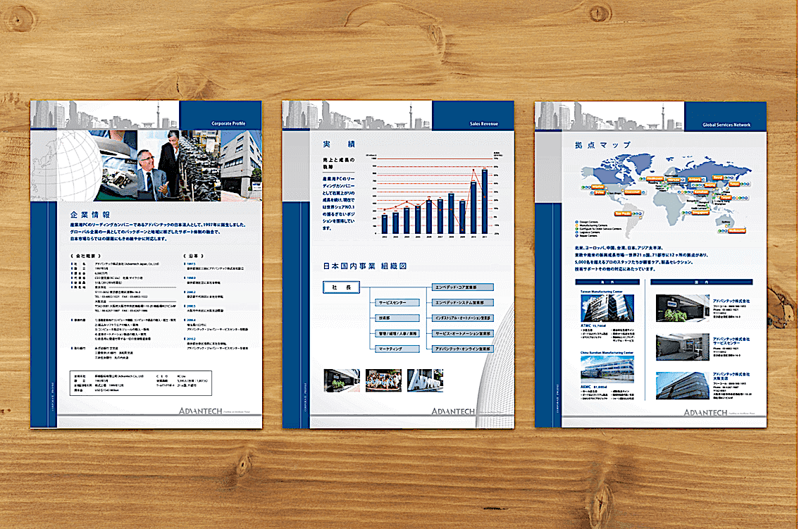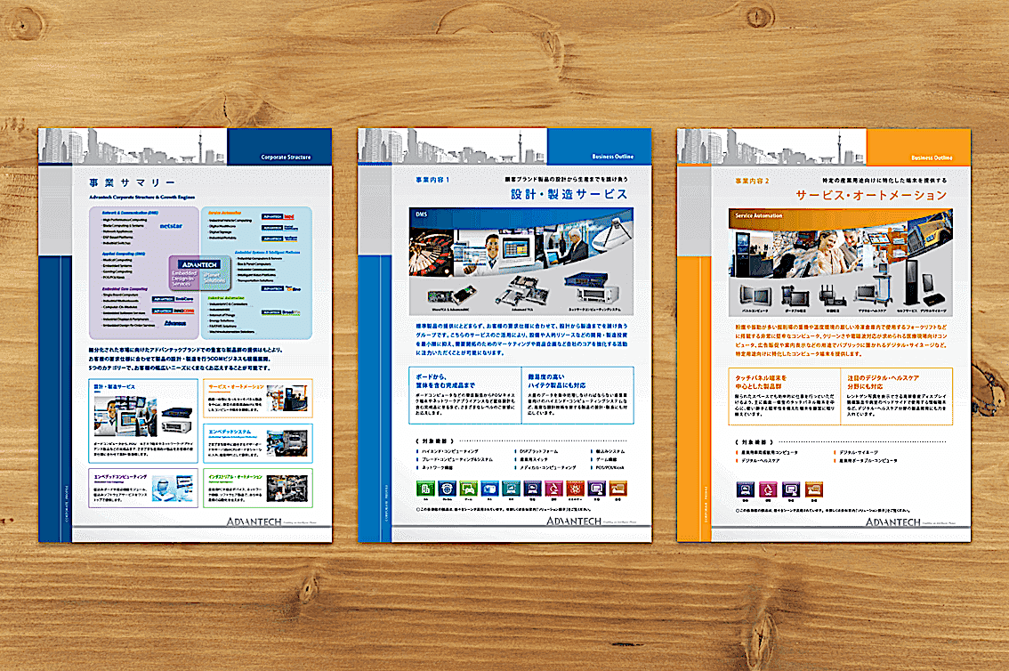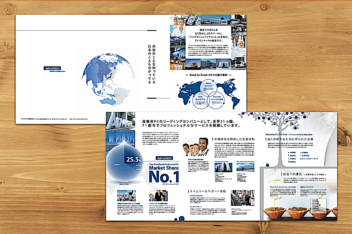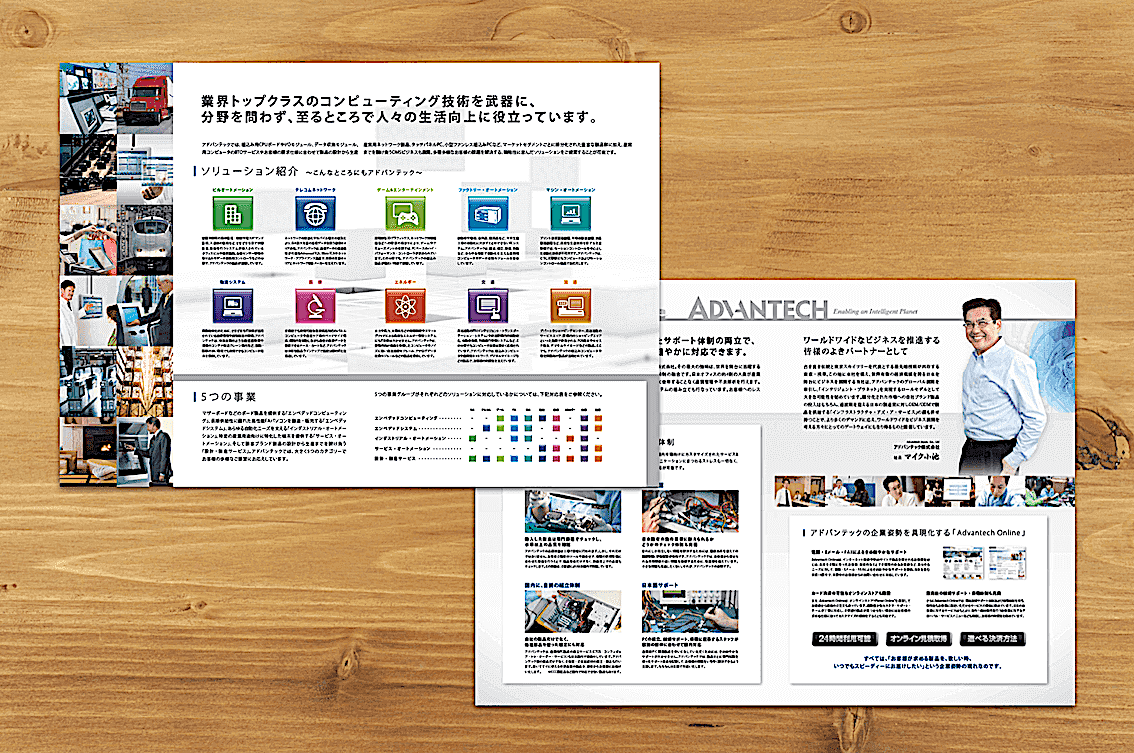 eプラットフォーム・サービス・プロバイダを軸に産業用コンピューティング、eオートメーションなど、様々な分野で世界トップシェアを維持する企業の日本法人。「視野は世界」、「技術とサポート力は、世界が認める、日本の信頼性」をアピールポイントとしました。また、製造業製品は大小様々なシステムの中に組み込まれている為、個々を紹介しても伝わりにくい為、社会環境のどのシーンで活躍しているかを紹介し、それらを具体的な生産部門に骨付し、ひと目で分かるようにまとめました。