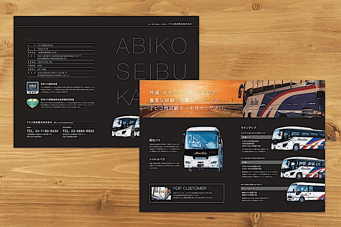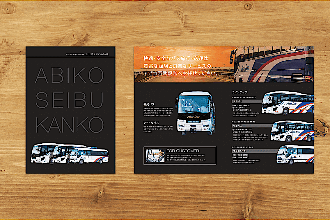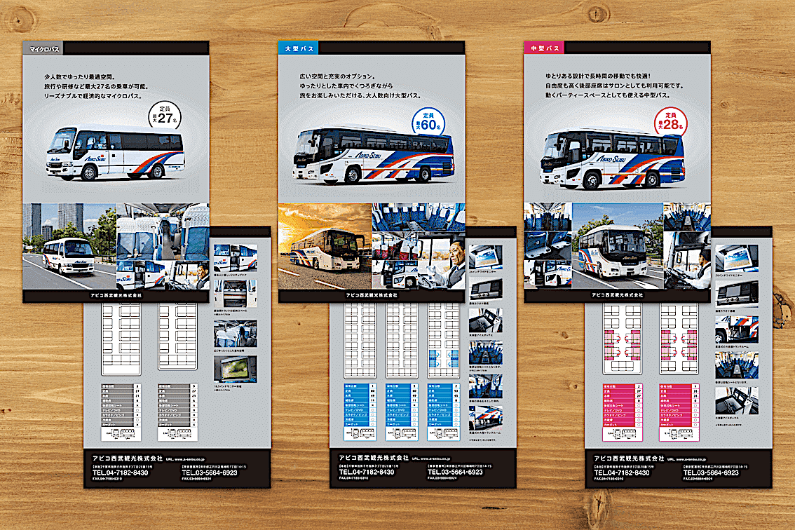 千葉県・東京都などで観光バス旅行や送迎をプロデュースするアビコ西武観光のサービス案内パンフレットを作成。ターゲットである旅行代理店に向けて同社のバスのラインアップを紹介しました。全て同じアングルでバスを撮影し、「大型」「中型」「マイクロ」それぞれのバスのサイズ感を一見して比較できるようレイアウトしております。