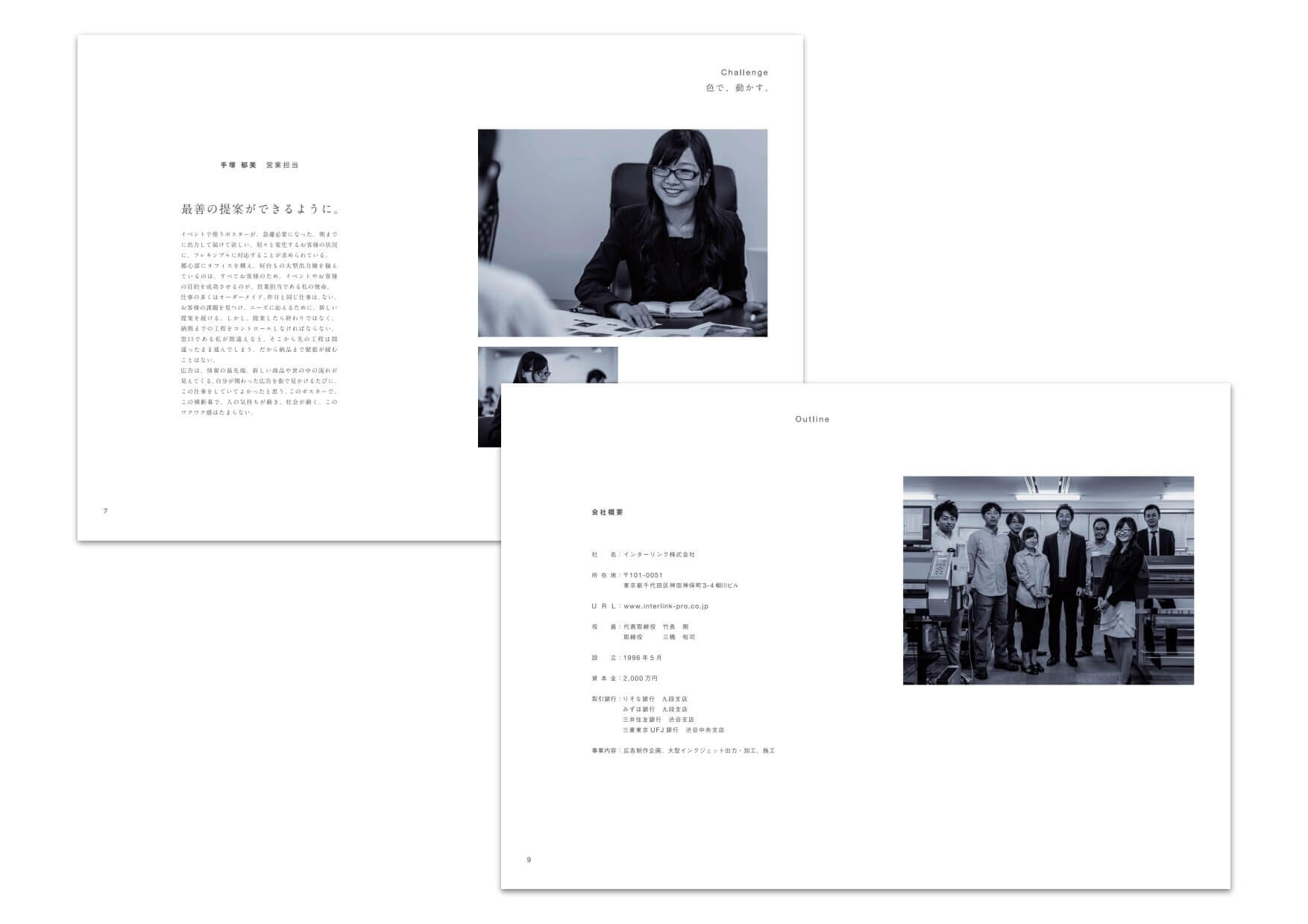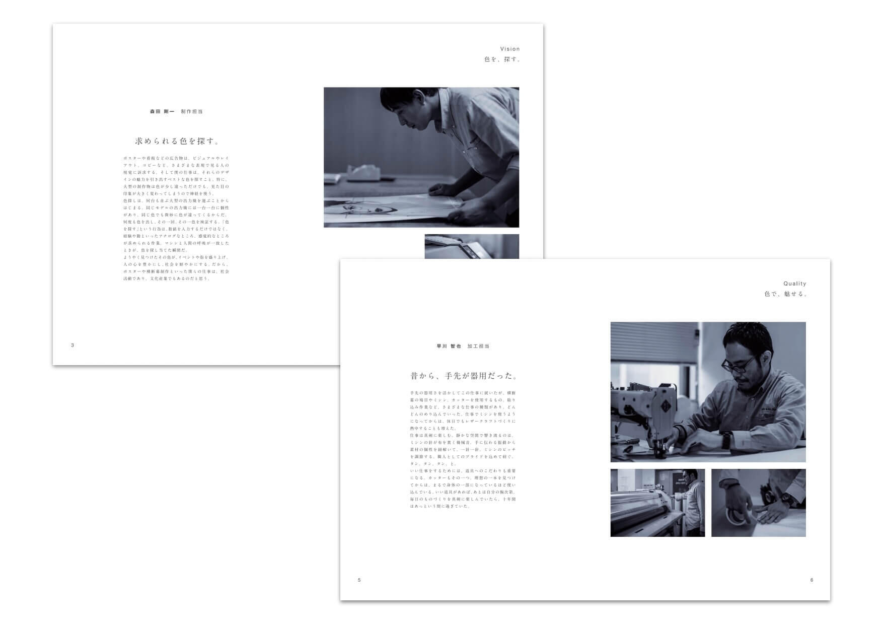 会社情報や業務内容を伝える通常の会社案内とは異なり、色をつくる制作担当者、加工を担当する職人、営業を担当するプランナーなど、スタッフ達の生の声で仕事の姿勢を伝え、クオリティを感じて頂けるよう、コンセプトブックを作成。ブランドの姿勢が伝わるよう、デザインさせて頂きました。