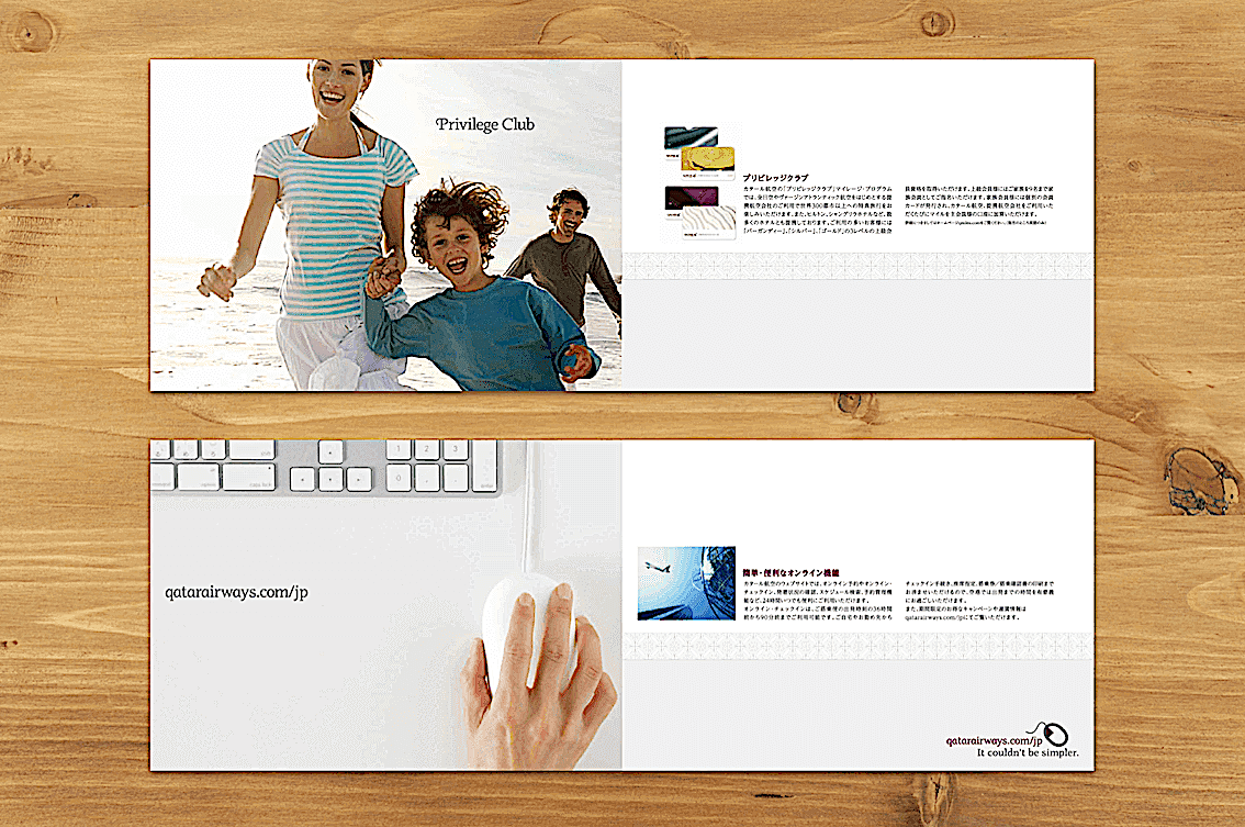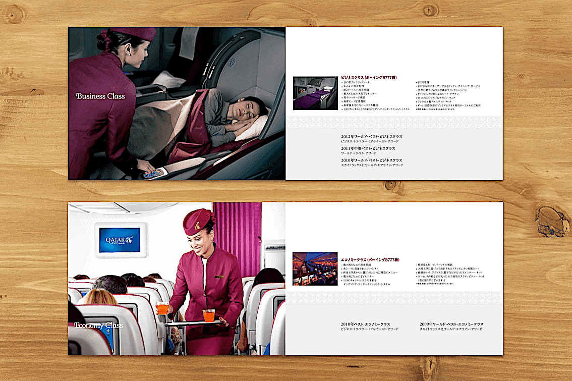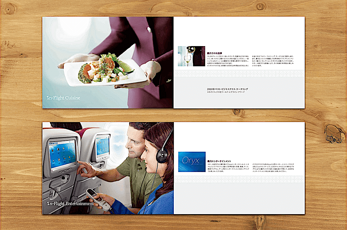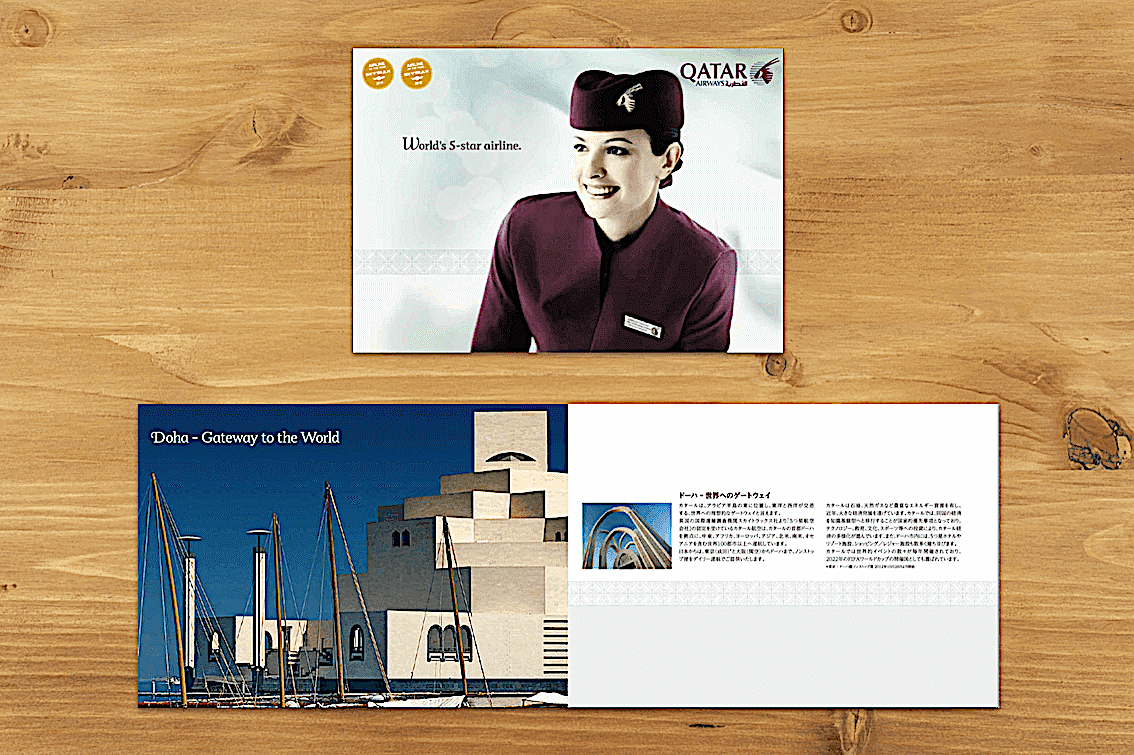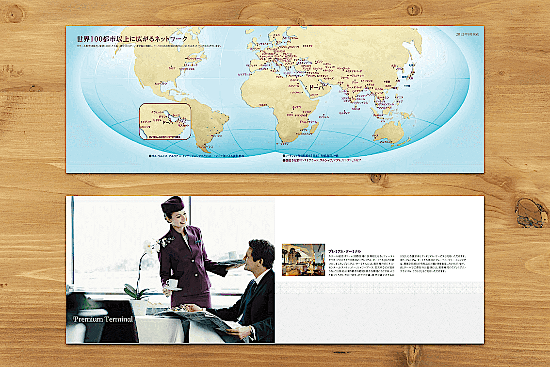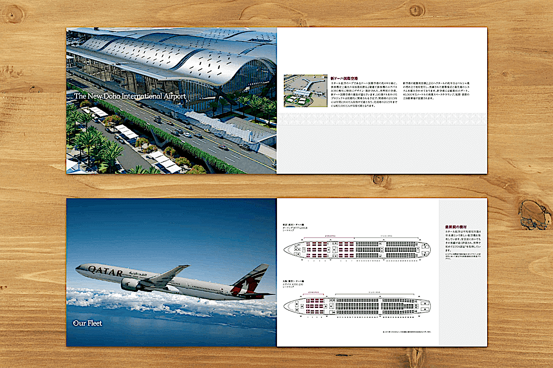 カタール航空・日本支社様からのご依頼を受け、同社PR用パンフレットを企画提案させて頂きました。本パンフレットは、カタール国への理解と、カタール航空のPRを目的に、日本国内で行われる各種イベント時の配布を予定しており、不特定多数の方に配布することから、専門的な表現を避け、直感的に感じて頂けるパンフレットを制作コンセプトに掲げています。全24ページ構成となった今回のパンフレットでは、カタール国について、自社機のシートやサービスについて等、カタール航空を初めて認知される方にも直感的な理解が得られ、同時にカタール航空のコンセプト “ステイタス”を感じて頂けるよう、ビジュアル中心のゆとりあるデザインに仕上げています。
