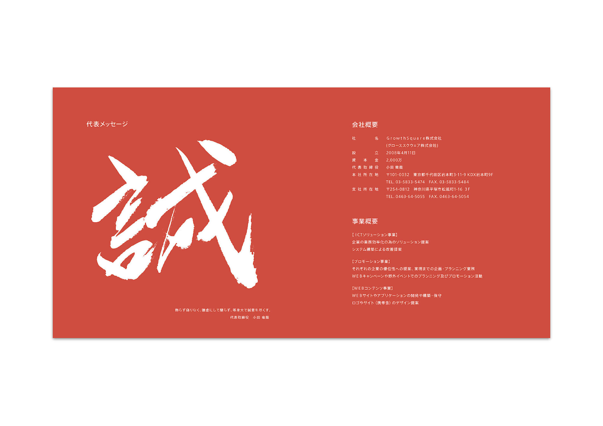 基幹系システムの企画・開発・運用などをコアビジネスとするグローススクウェア。新規営業で使用した際、記憶に残るようなインパクトのある会社案内が求められていました。そこで、会社概要や事業内容などを羅列した表現ではなく、ストレートで強いメッセージを各ページにレイアウト。白地に赤文字のみ。ノンビジュアルでシンプルな構成にすることで、インパクトのある構成にしました。社名に含まれている「スクウェア」から、形状もスクウェア(正方形)にしてより印象的なものに。代表メッセージも長い文章ではなく漢字一文字にするなど、同業他社との差別化が図れる会社案内が完成しました。