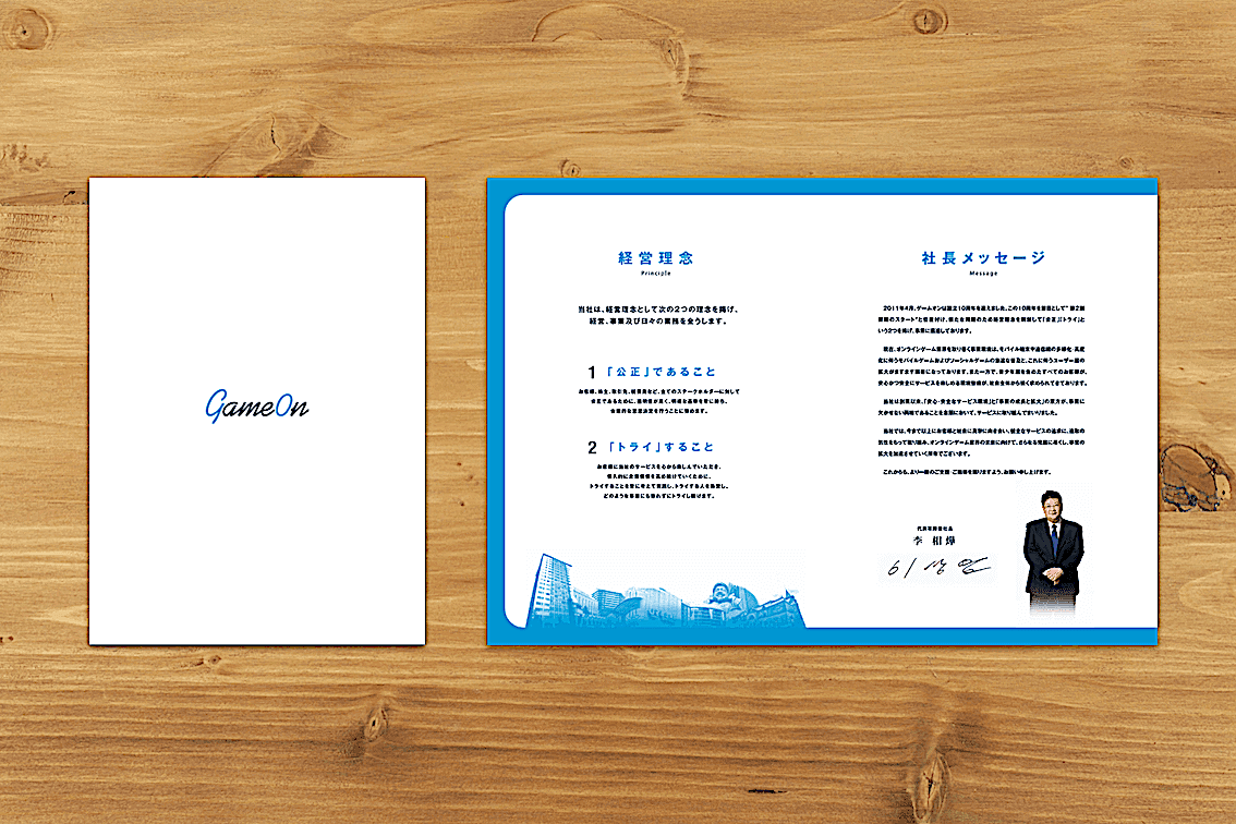 オンラインゲームサービス事業を行う株式会社ゲームオンのパンフレット制作実績です。同社の開発するキャラクターを紙面各所に配し、事業を直感的に伝えるとともに、企業ブランドのトーン&マナーに準拠したシンプルで清潔感のあるパンフレットに仕上げています。