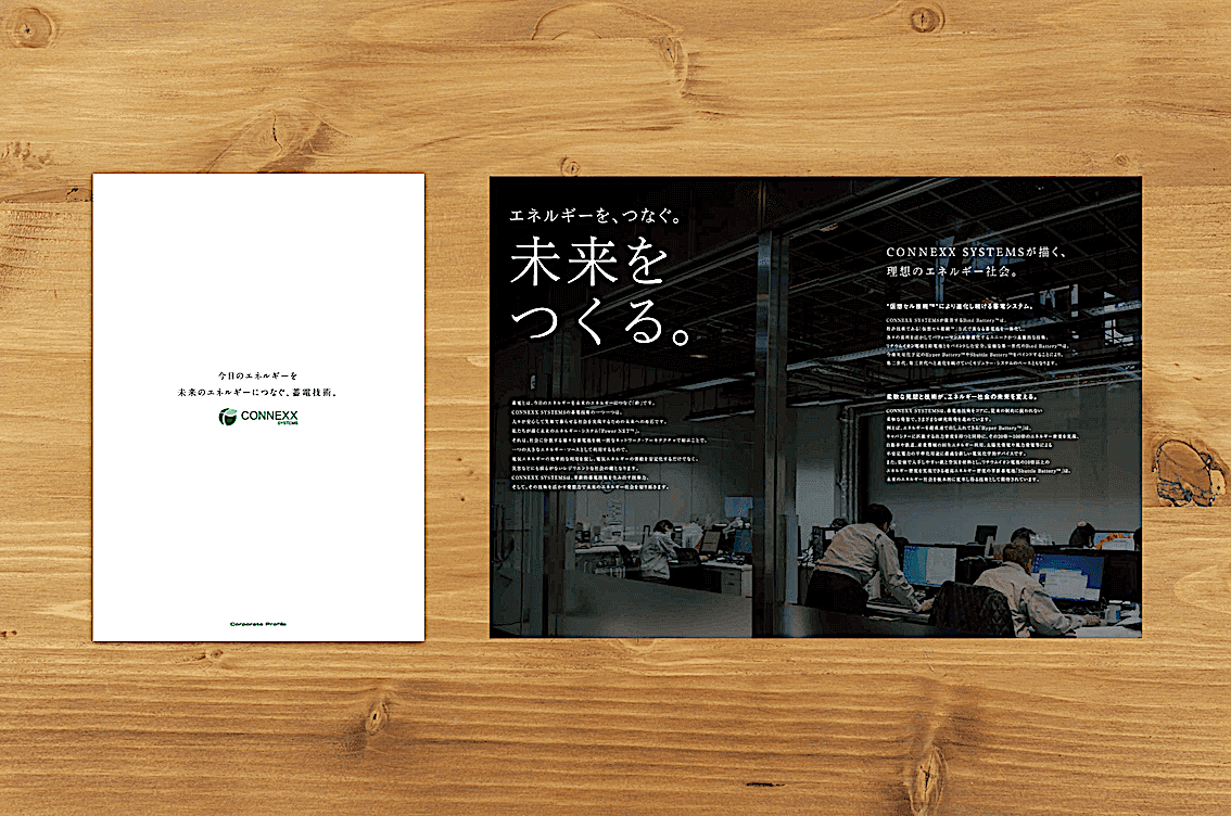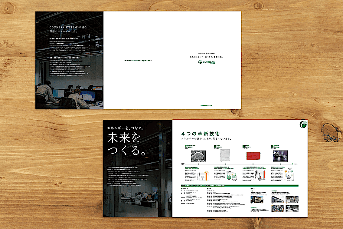 CONNEXX SYSTEMS様。特許技術を有する4つのバッテリーを紹介すると共に、コンセプトや企業情報がしっかりと伝わる会社案内をご要望頂き、複数の企画提案から本案をご採用頂きました。コンセプトを見開きでしっかりと伝え、次いで製品紹介へと展開する構成案です。また、会社案内と同時進行で各技術のロゴマーク開発にも着手。ネーミングの頭文字をモチーフに、それぞれの技術をシンボル化したデザイン案をご採用頂きました。