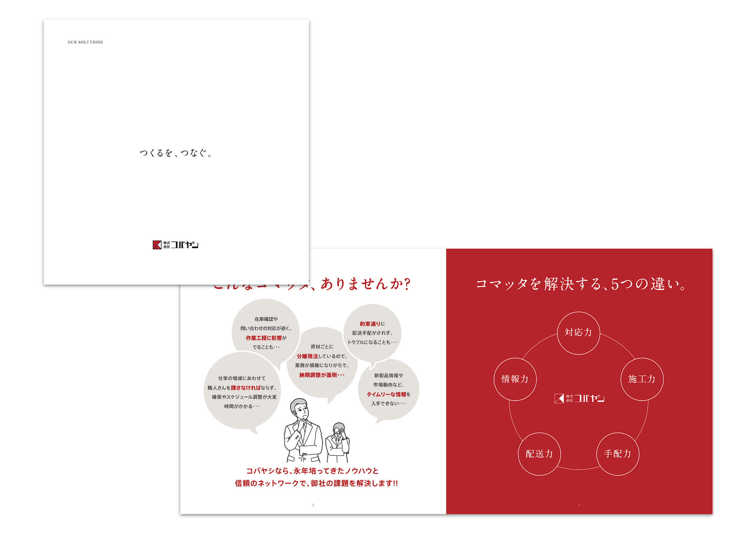 会社案内では、自社の強みはどこにあるのかが明確に伝わるよう、同社の特徴を5つの違いとして訴求。対応力、施工力、手配力、配送力、情報力の5つの違いを持つ同社は、商社と施工店双方の強みを兼ね備えた企業であることを、端的なメッセージで訴求しました。