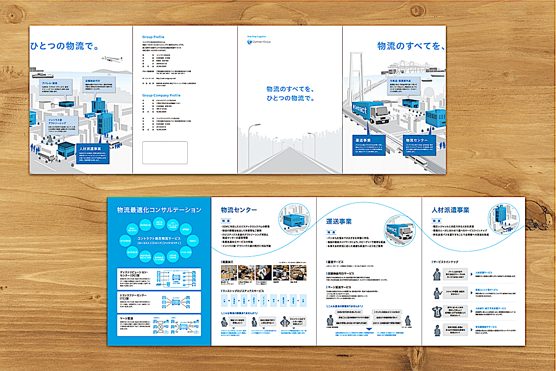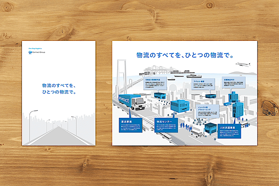 「自社の強みが伝わるパンフレットを作成したい」とのご要望を受け、綿密なオリエンテーションから複数の企画提案をさせて頂いた今回。営業担当者のプレゼンテーションを視野に入れた、コピー軸の構成、イラスト軸の構成、その両方を網羅した構成、さらにはコンセプトブックのご提案から今回採用頂いたのは、それぞれの良い部分をまとめ上げた構成案。表紙には「物流のすべてを、ひとつの物流で。」のコピーを開発。見開きに街のイラストを配置することで物流の全てを紐解き、解説するようレイアウトしています。中面では事業詳細をシンプルにデザインし、要点を直感的に理解できるパンフレットに仕上げています。