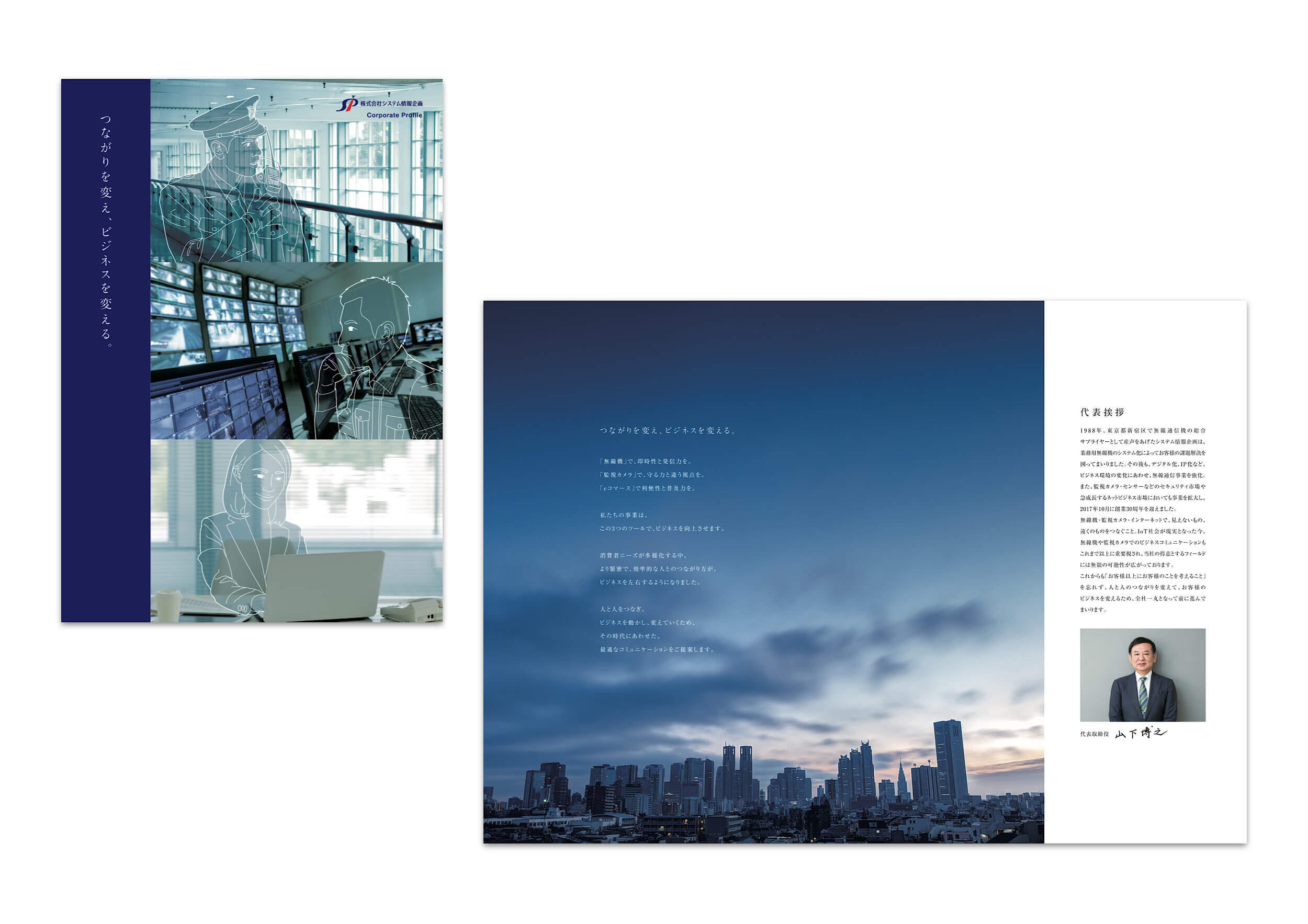 無線通信機の総合サプライヤーとして、無線通信システムの総合コンサルティングや各種業務無線システムの販売・施工・保守管理、防犯・防災システムの総合コンサルティングなどを展開する株式会社システム情報企画。従来の「無線通信システム」「セキュリティシステム」「無線機販売サポート」に加えて、「WEBコンサルティング」を新事業として立ち上げたことから、4事業を紹介する会社案内の制作をご依頼いただきました。ただ事業を紹介するだけの会社案内にならないように、まず初めに「つながりを変え、ビジネスを変える」というキーメッセージを開発しました。それを起点にして、紙面はコーポレートカラーのブルーを基調としつつ、堅実で信頼感を感じさせるシンプルなデザインに。お客様の様々な課題解決やご要望に応えられる会社であること。そして、ニーズが多様化する中で、「人」「社会」「情報」「技術」をつなぎ、関わるすべての人々・地域社会を元気に、豊かにしたいという理念を伝えられる会社案内を目指しました。