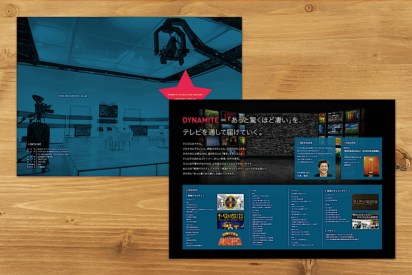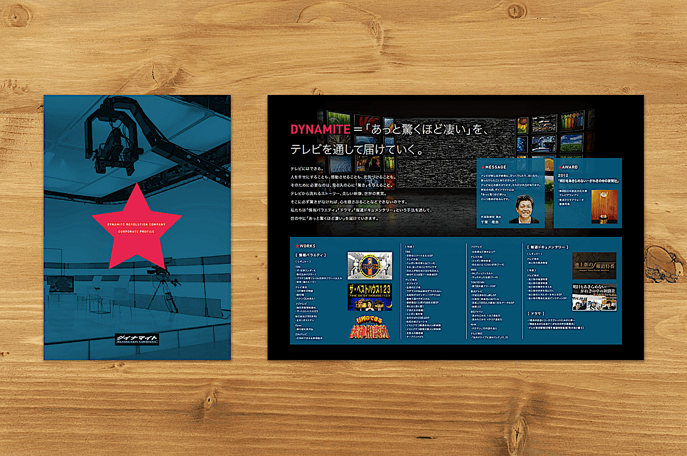 人気テレビ番組の制作を行うダイナマイトレボリューションカンパニー。社名のDYNAMAITEは「あっと驚くほど凄い」を意味しており、見る人の心に驚きを与え、心を揺さぶるテレビ番組を届けることをミッションに掲げている。日本テレビ、TBS、フジテレビ、テレビ東京、テレビ大阪などの民放各局から、BS/CS各局に至るまで、情報バラエティ、ドラマ、報道ドキュメンタリーにおいて数々の番組制作を手がけている。