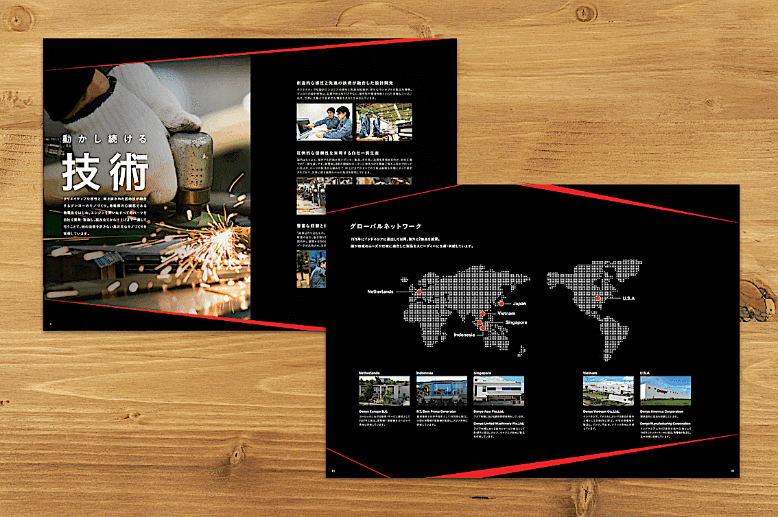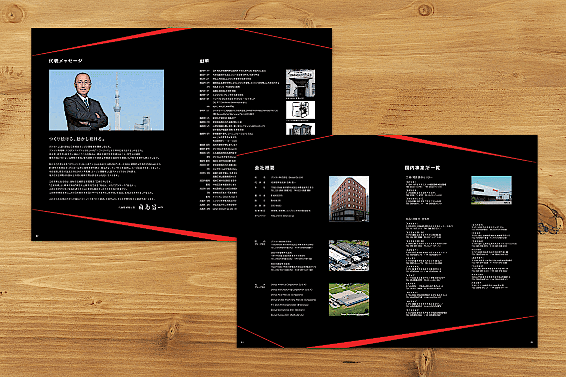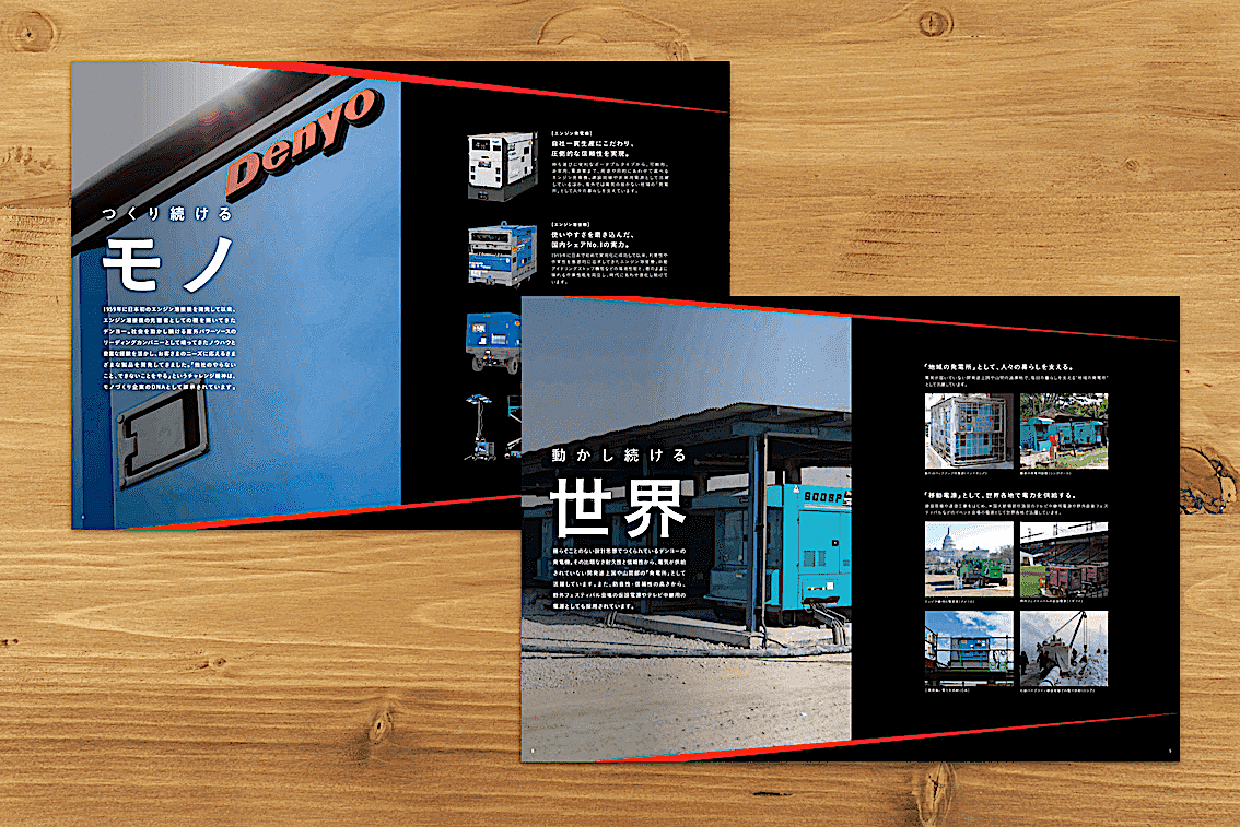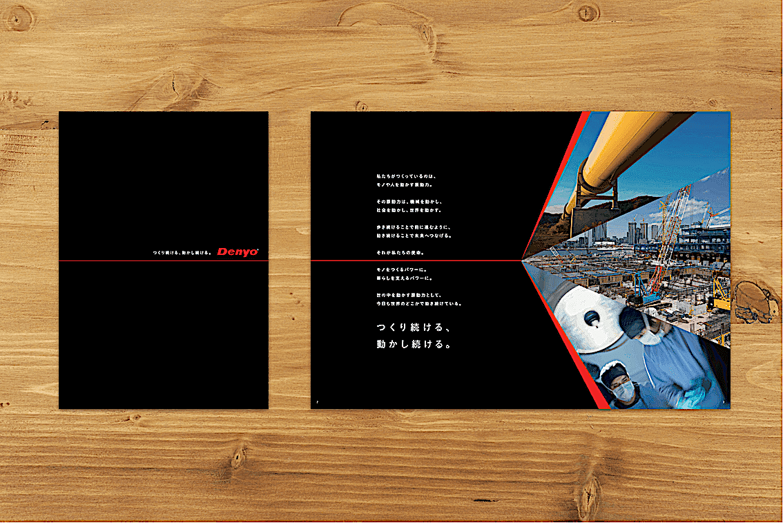 屋外用エンジン発電機・溶接機の企画・開発・製造を行うデンヨー株式会社。エンジン発電機・エンジン溶接機のトップメーカーで、屋外用パワーソースのパイオニアでもある。夜間の工事現場を明るく照らす投光機やキャンプなどで使用する携帯式発電機も揃えており、米、アジアで現地生産を行っている。そんな同社からご依頼頂いたのは、会社案内の作成。メーカーとしての責任と誇りをメッセージと共に余すことなく一冊のパンフレットにまとめ上げました。