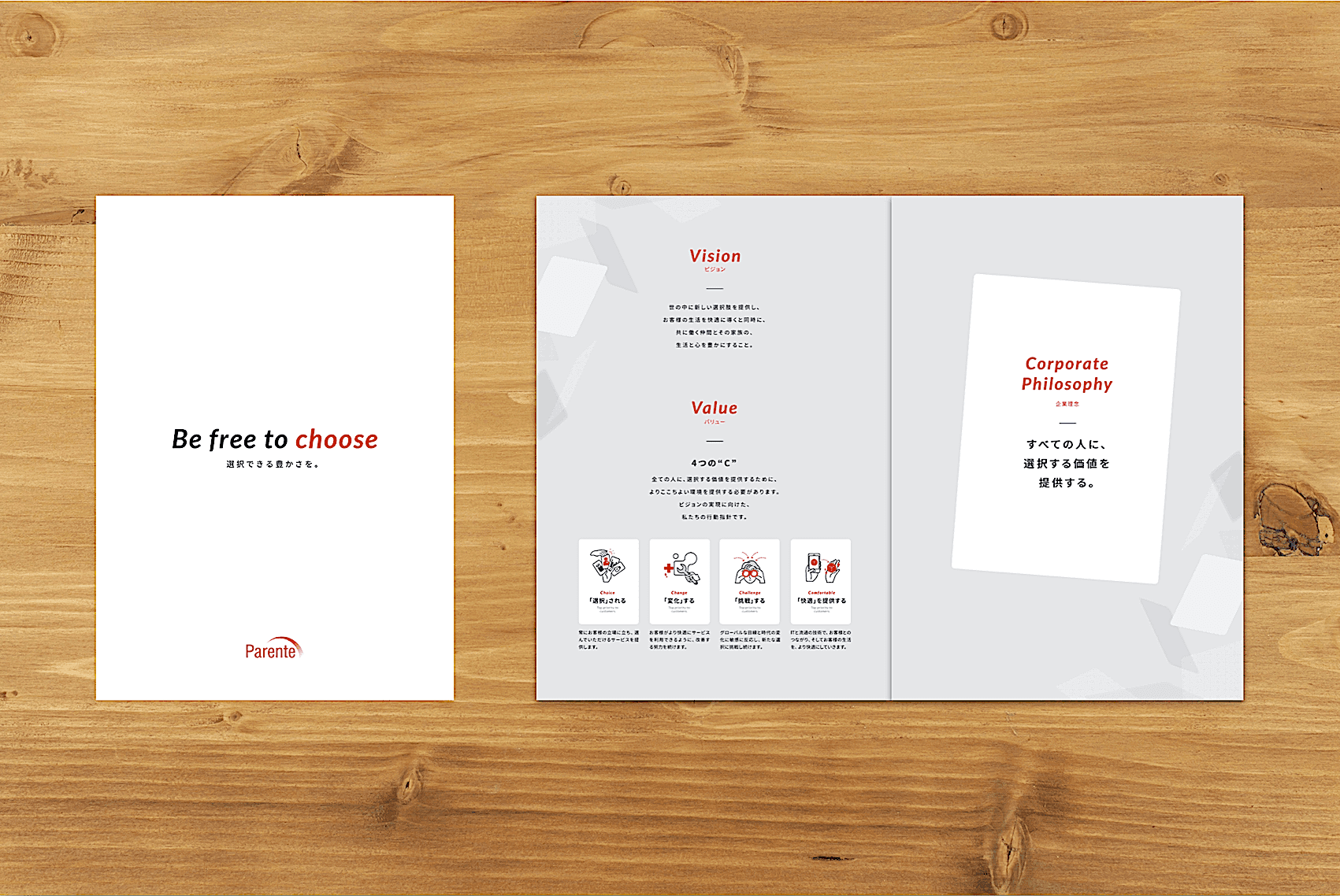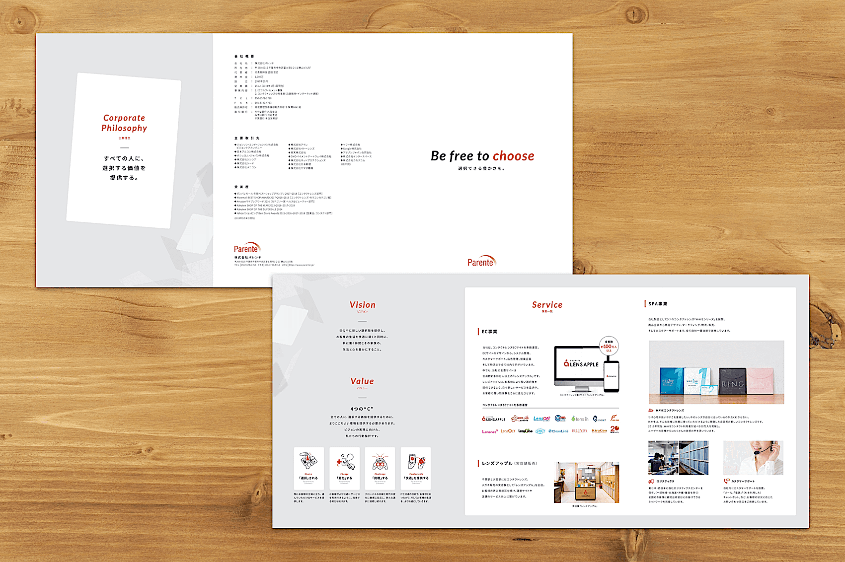 「選択できる豊かさを。」そんなメッセージから展開される、EC事業、コンタクトレンズ小売事業を手掛ける企業の会社案内パンフレット制作実績です。すでに展開されるWebサイトに準拠したデザインで、企業VI構築を図りたい、とのご要望を受け制作に着手。ビジョン、バリューの紹介から、事業案内へと続く、シンプルながらも見やすく使いやすい、会社案内パンフレットに仕上がりました。