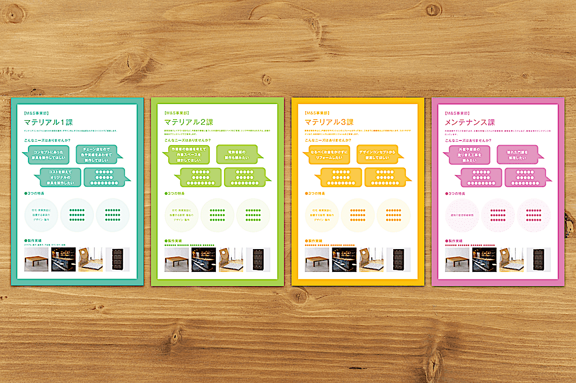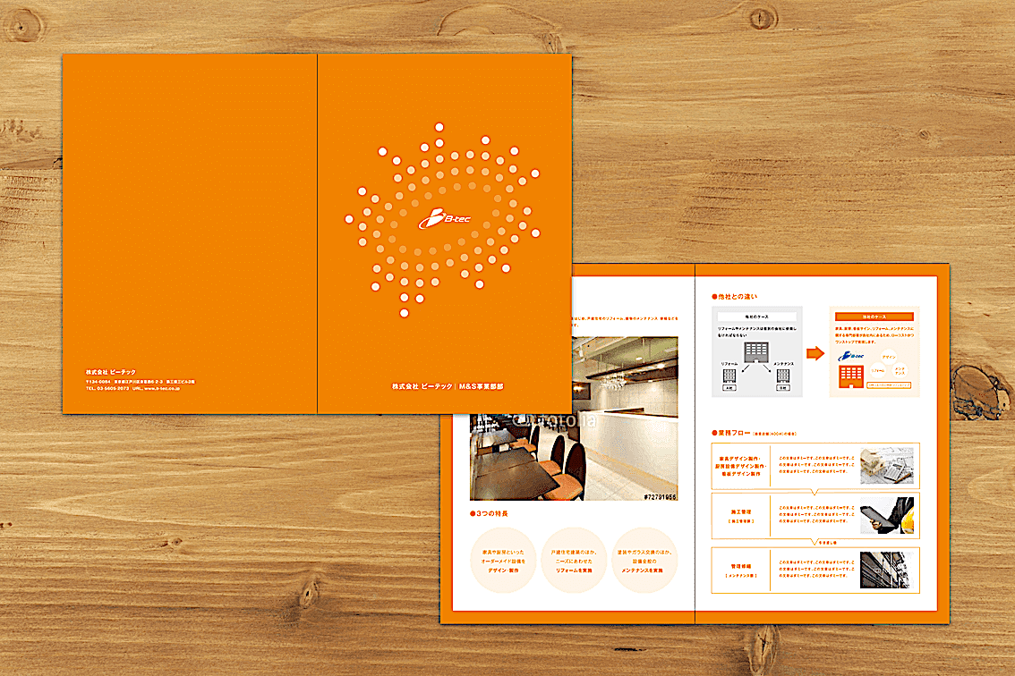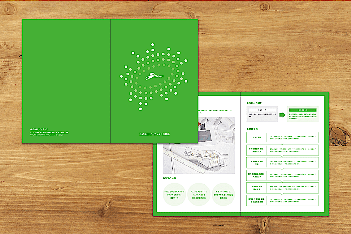 活用シーンに合わせて、提供する資料の可変性がある会社案内パンフレットにしていきたい。そんなご要望を受け、企画デザインに着手した、総合建設会社の会社案内パンフレット制作実績です。ご提案させて頂いた仕様は、ポケットホルダー+事業毎のリーフレットスタイル。持参する担当者が、直感的に必要な資料を見分けられるよう、リーフレット毎に色を変え、カラフルなデザインに仕上げています。リーフレットは全7種類。それをまとめるポケットホルダーは、事業を包括するデザインとしました。