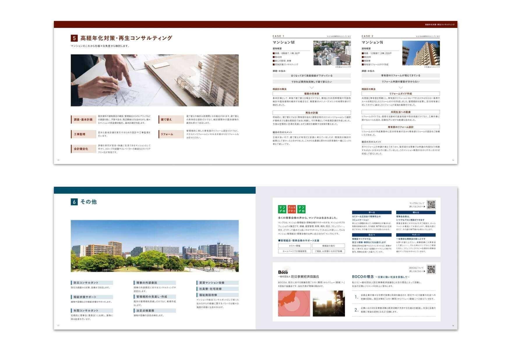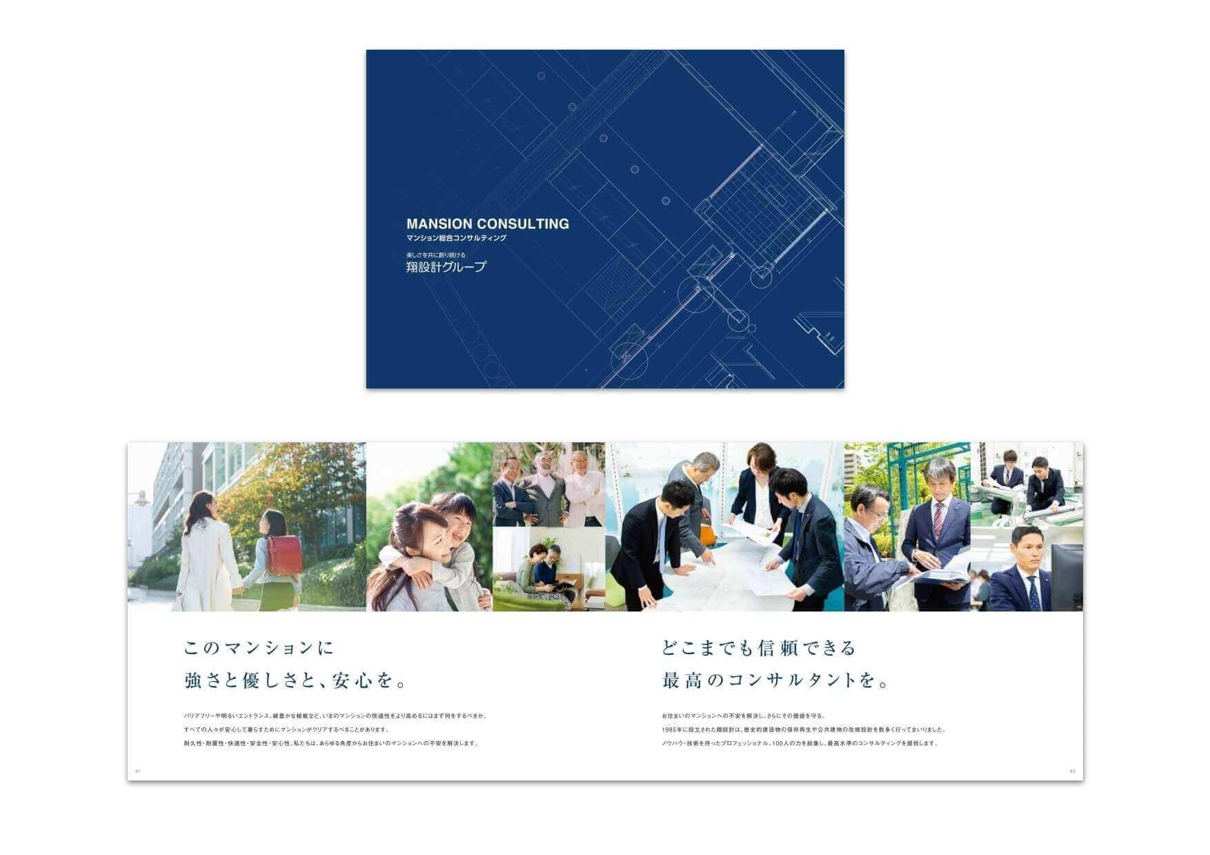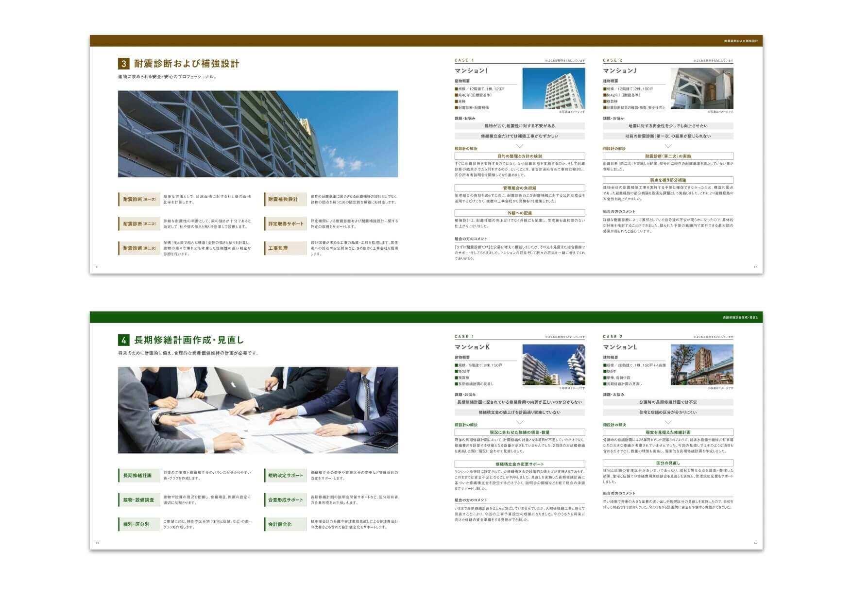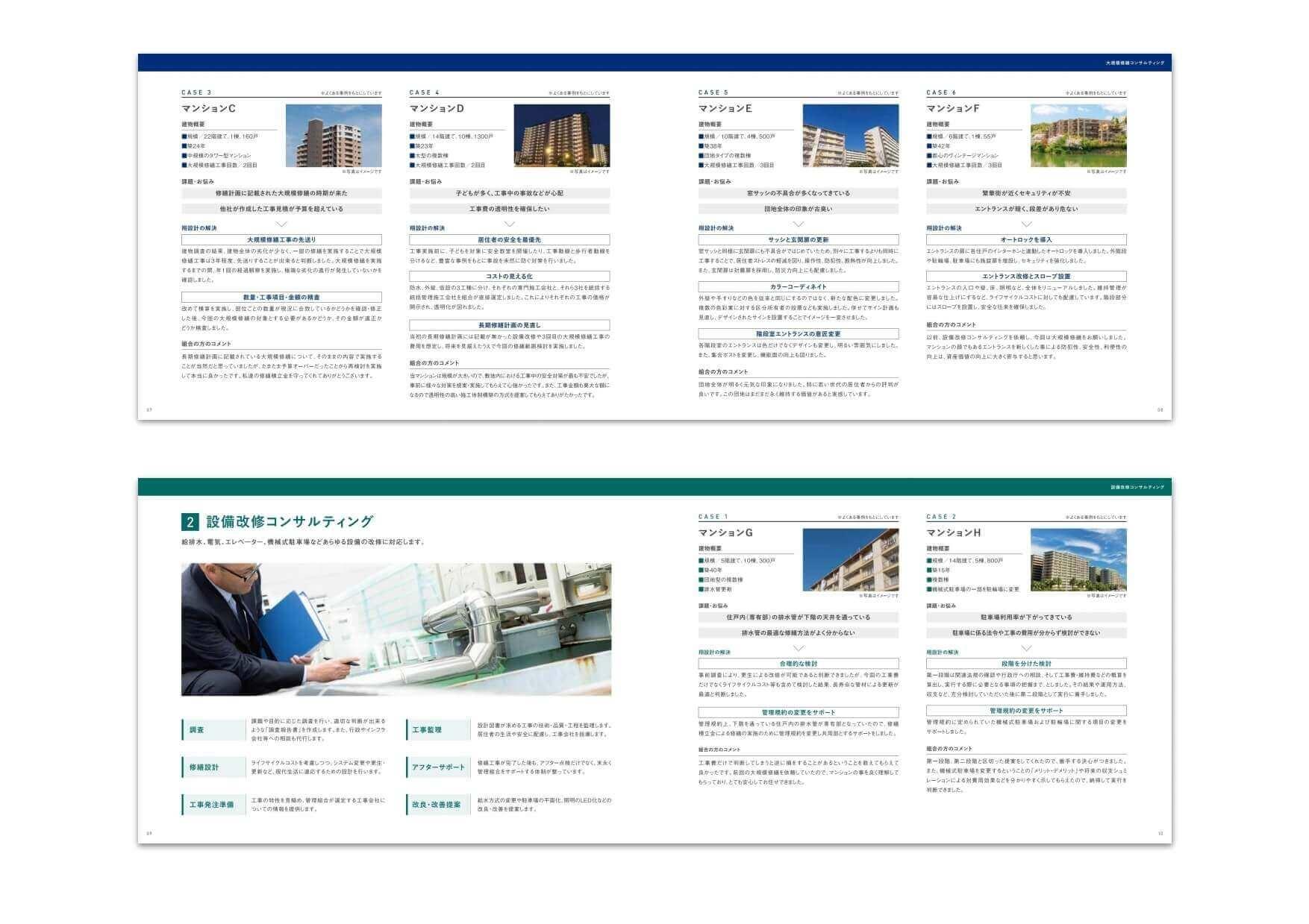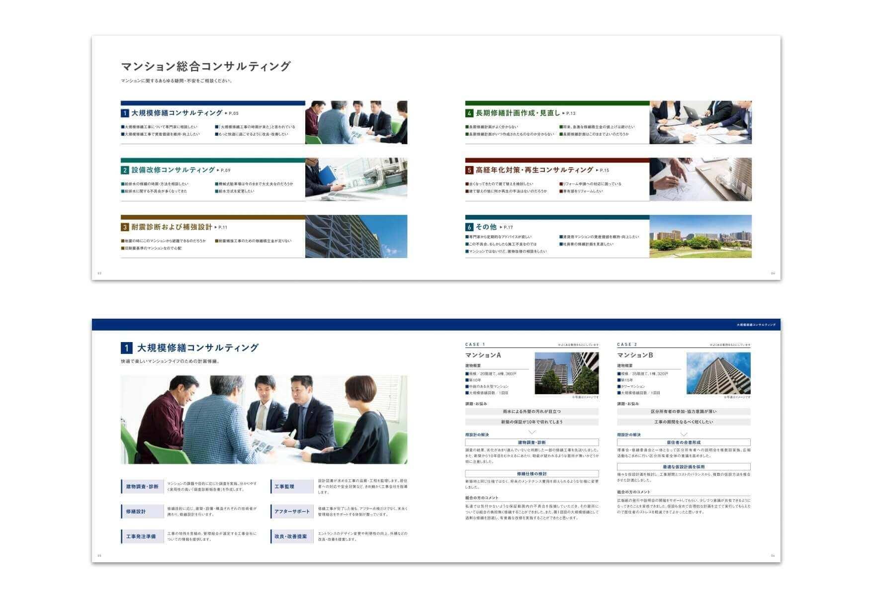 建築企画・開発や設計・監理を主事業とする翔設計グループのマンション総合コンサルティングサービスを紹介する営業パンフレット制作実績です。マンション総合コンサルティングで行う「大規模修繕コンサルティング」「設備改修コンサルティング」「耐震診断および補強設計」「長期修繕計画作成・見直し」「高経年化対策・再生コンサルティング」などにおけるサービスや実績をそれぞれに紹介し、お客様の不安を解消すると同時に、信頼獲得を図る営業パンフレットに仕上げています。
