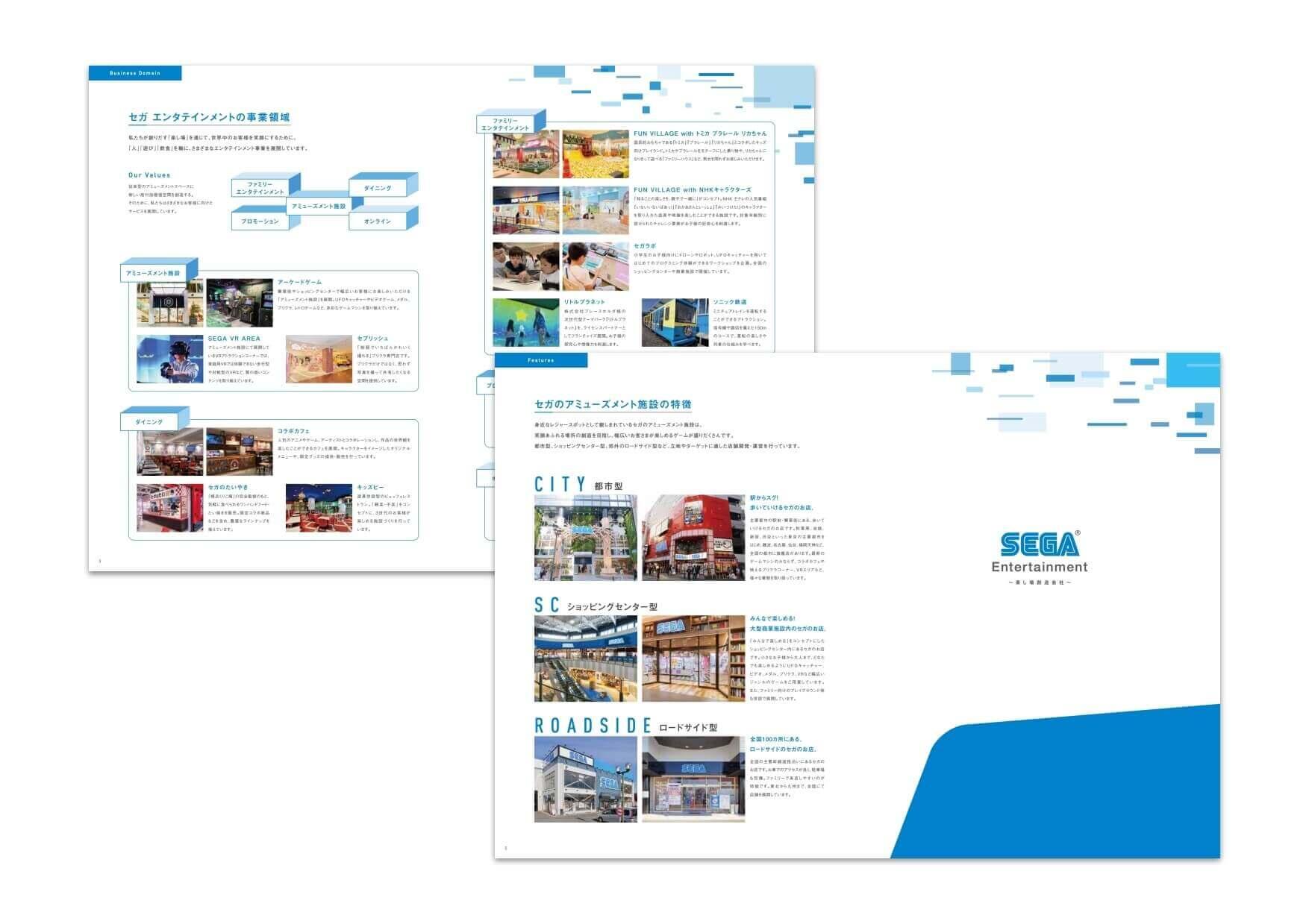 コーポレートカラーであるブルーを基調に、施設やお客様の写真を数多く使用。会社の詳細情報を伝えるだけでなく、「楽し場創造会社」というビジョンの通り、不動産や商業施設のデベロッパー、設計会社といったお客様にセガ エンタテインメントらしい「楽しさ」や「安心感」「将来性」を伝えられる会社案内を目指しました。