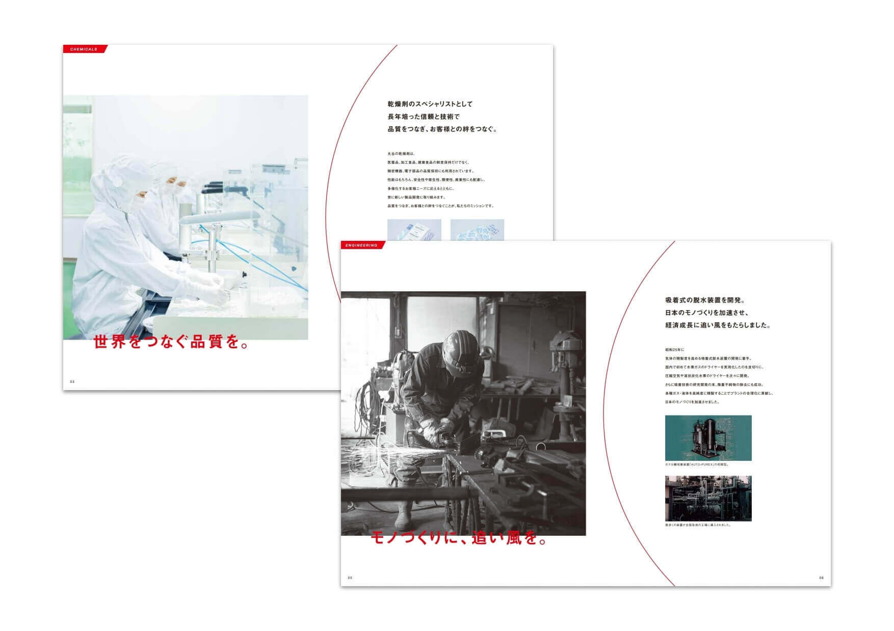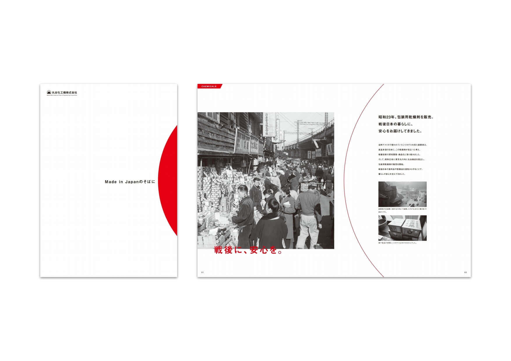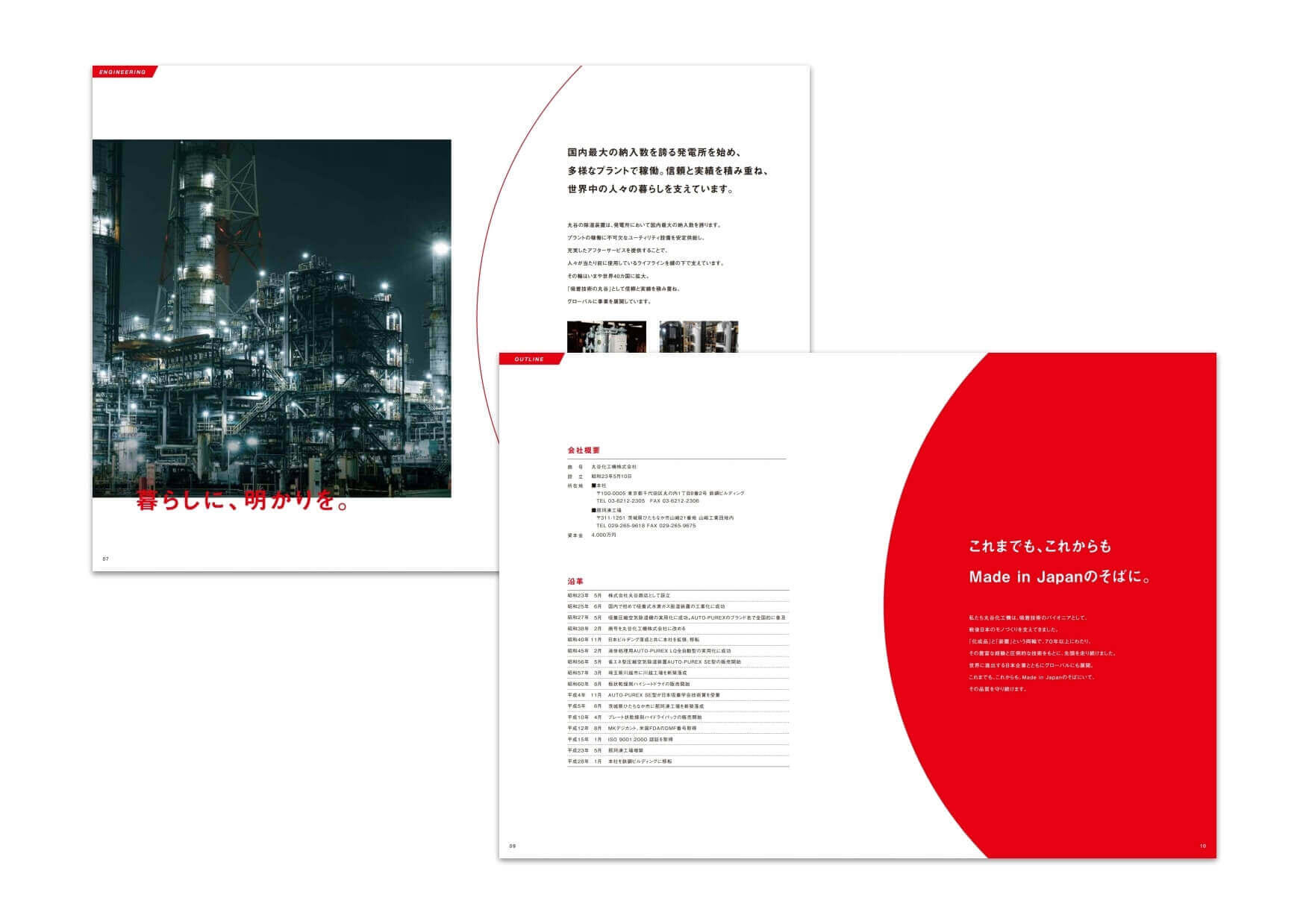 丸谷化工機様の会社案内を作成しました。丸谷化工機様は、創業から半世紀を超える歴史ある会社です。高い品質に定評があり、吸着技術で戦後日本の高度経済成長を支えてきた背景がありました。そこで「Made in Japanのそばに」というキャッチコピーを作成し、創業当初と現在において、どのように私たちの暮らしを支えてきたかを紹介。日の丸をモチーフにした上質なデザインで、品質の高さを感じさせるパンフレットとしました。