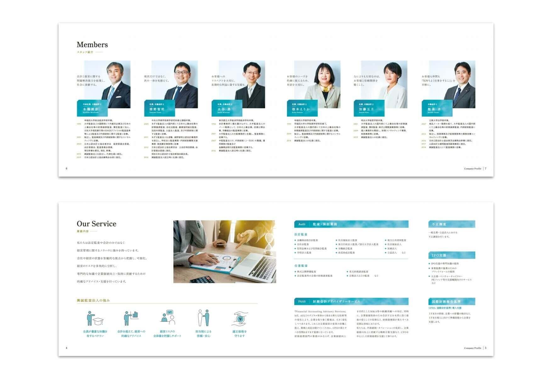 監査法人として、誠実かつ公平に「クライアントの立場にたってアドバイスをする」というモットーを強く打ち出すパンフレットの制作依頼をいただきました。所属するメンバーのポートレートとともに経歴や業務に対する思いを掲載し、同法人が親しみやすく、かつ信頼できるビジネスのアドバイザーになることを訴求しました。サービス内容をできるだけ分かりやすくまとめ、理解のスピードを速めた構成にしています。