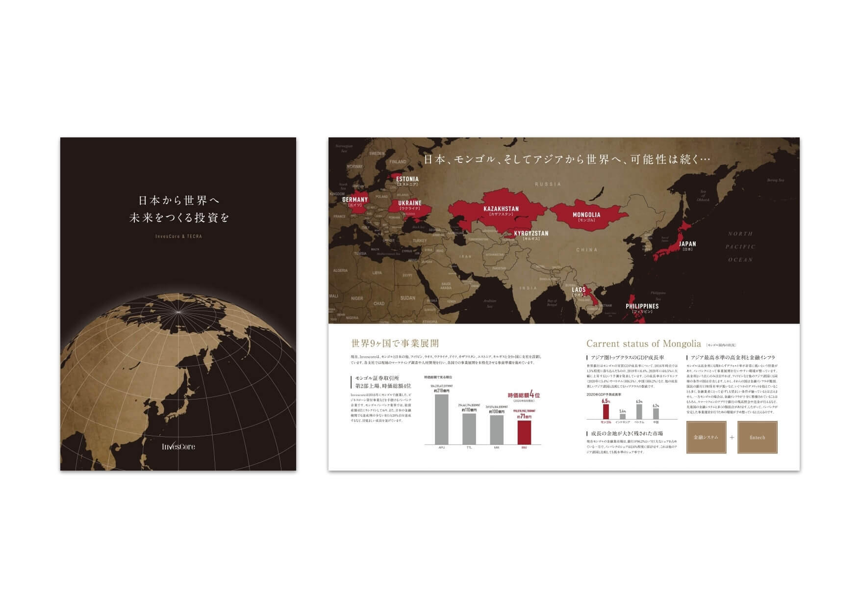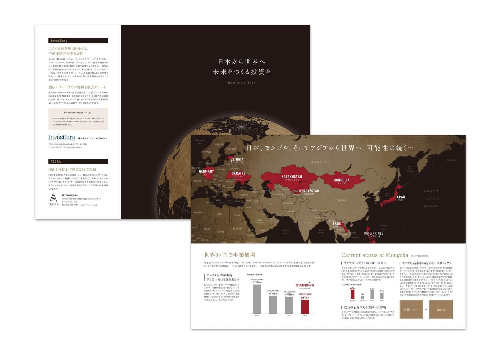 信頼性の向上を目的に会社案内パンフレットの制作依頼を賜りました。同社事業の中心地モンゴルにおける業界内での位置付けや市場有望性などで紙面を構成し、地球と世界地図を用いてグローバル・ビジネスを表現しています。