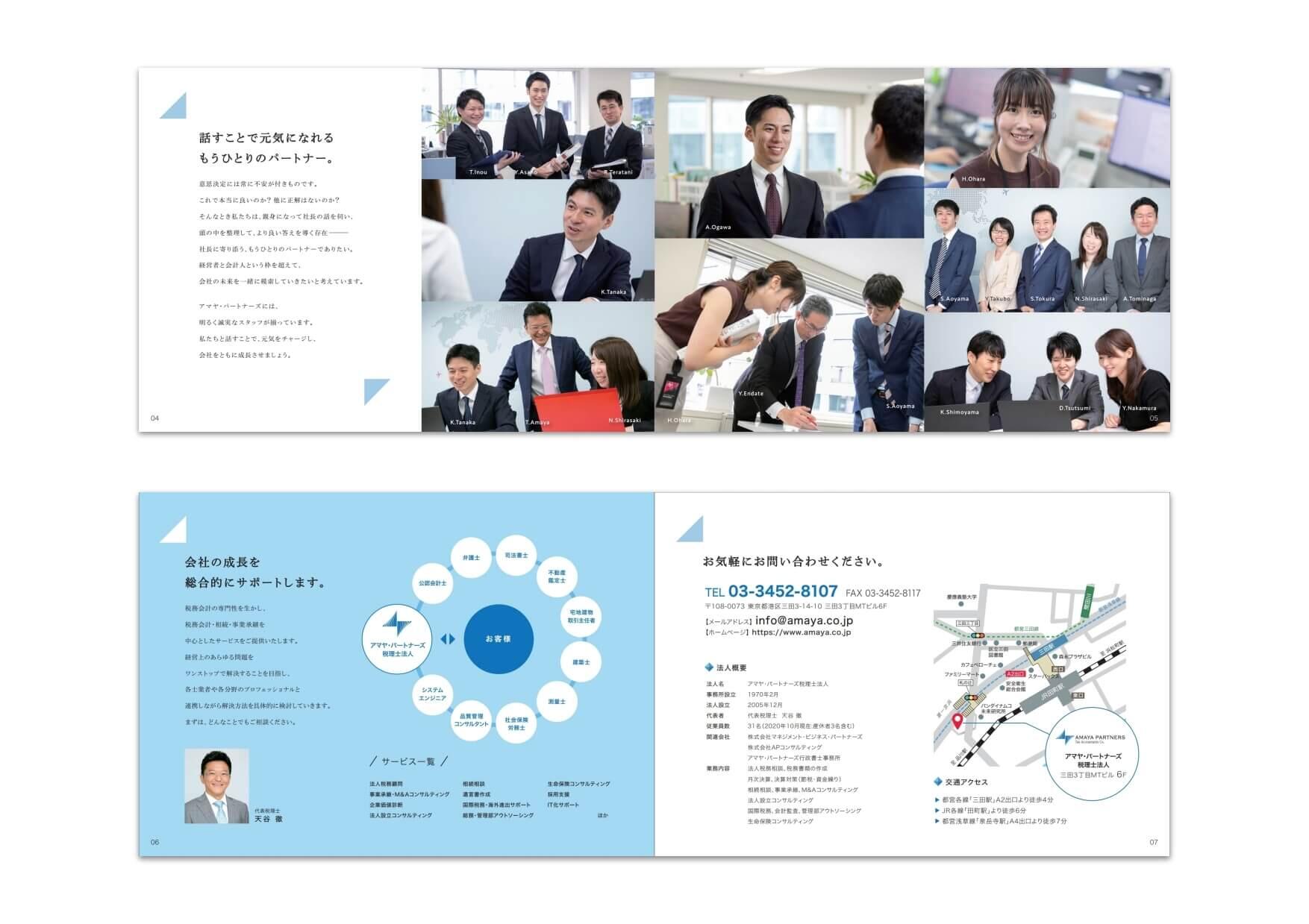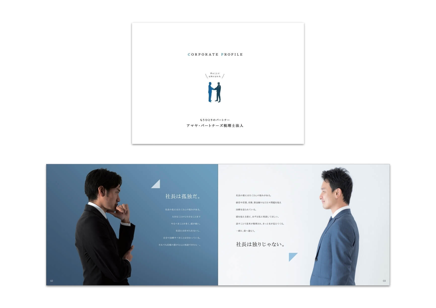 パンフレットのご相談を受け、会社案内を制作しました。同社は、会計人という枠を超えて、経営者に寄り添うことを大切にされており、「話すことで元気になれる」税理士法人を目指されています。そこで「もうひとりのパートナー」をコンセプトワードに、経営者とどのような姿勢で向き合っているかを、向かい合ったふたりのモノローグで表現。社員の顔を出し、明るく信頼できる会社の雰囲気を伝えました。