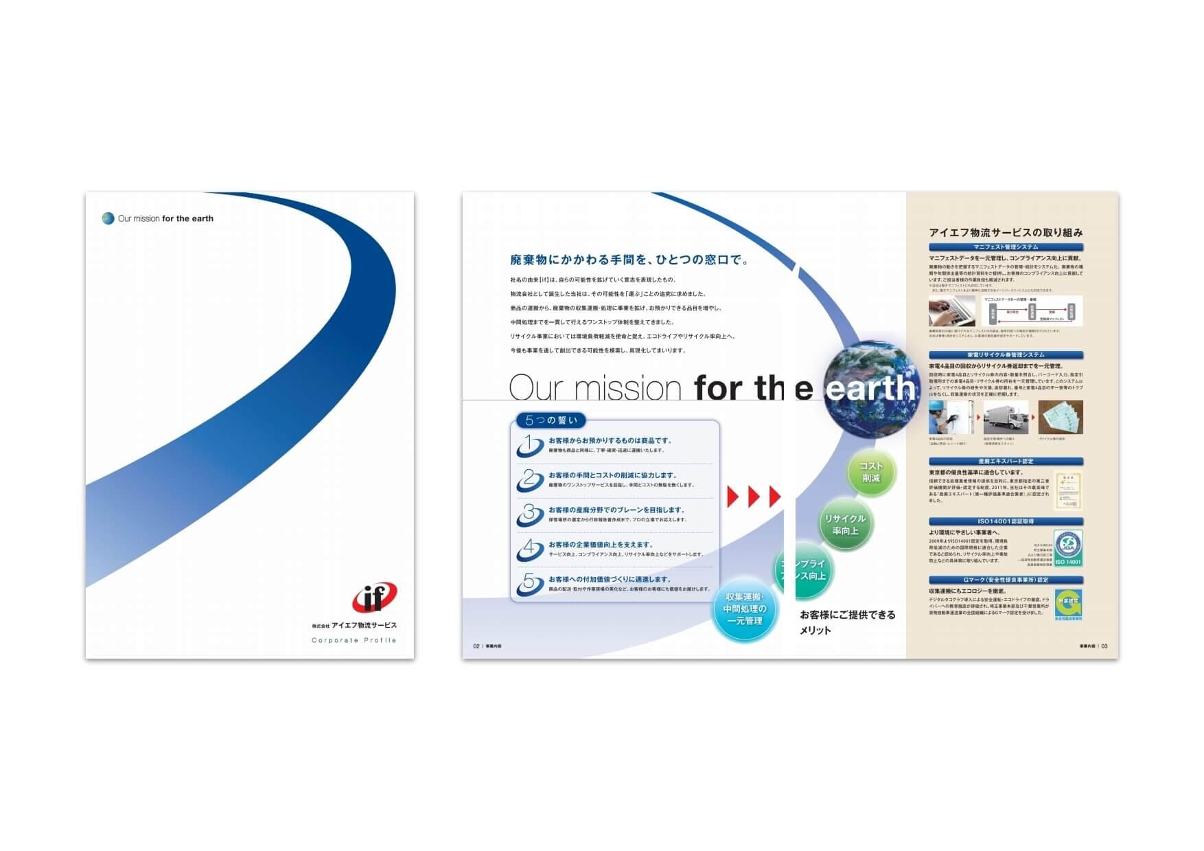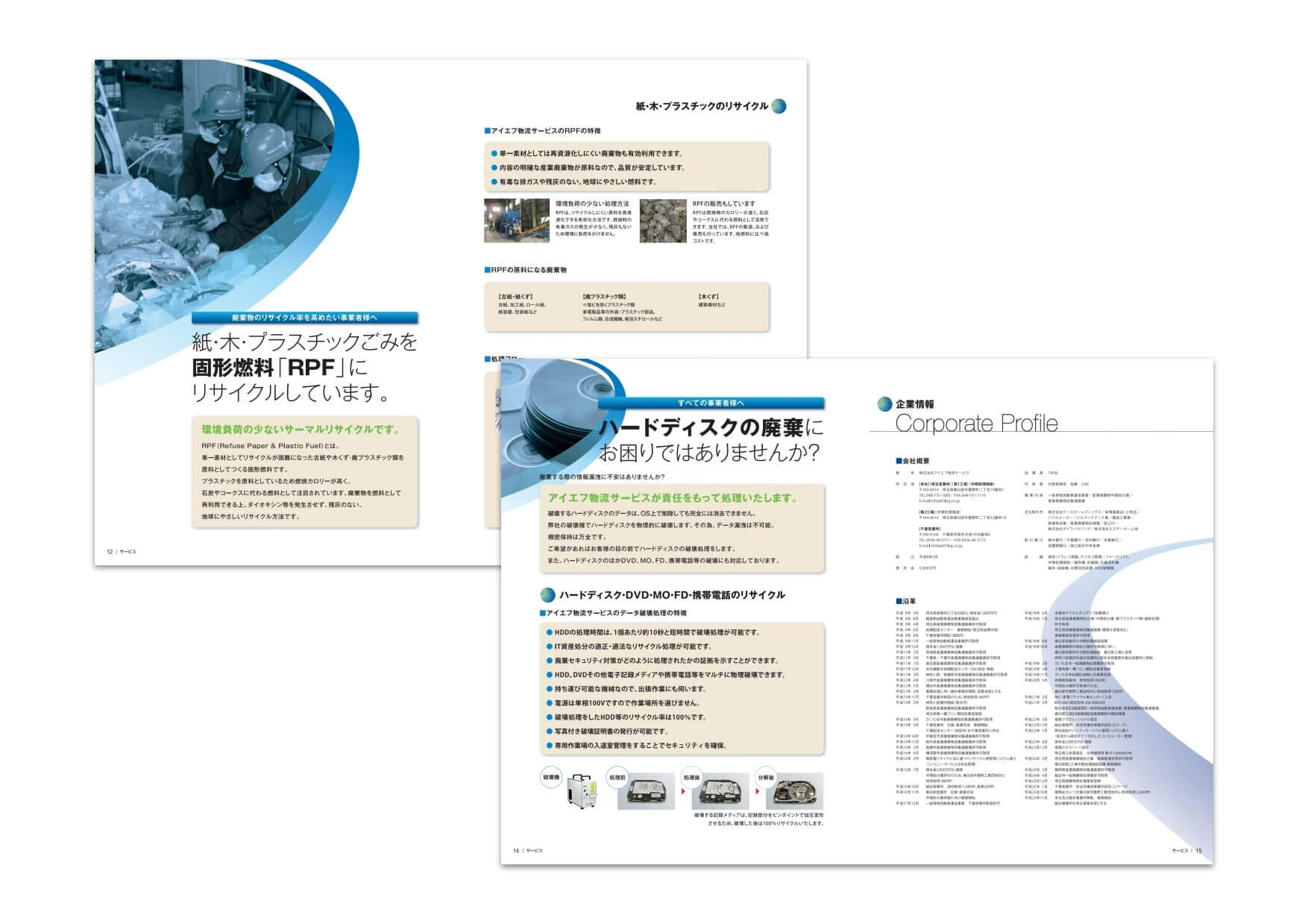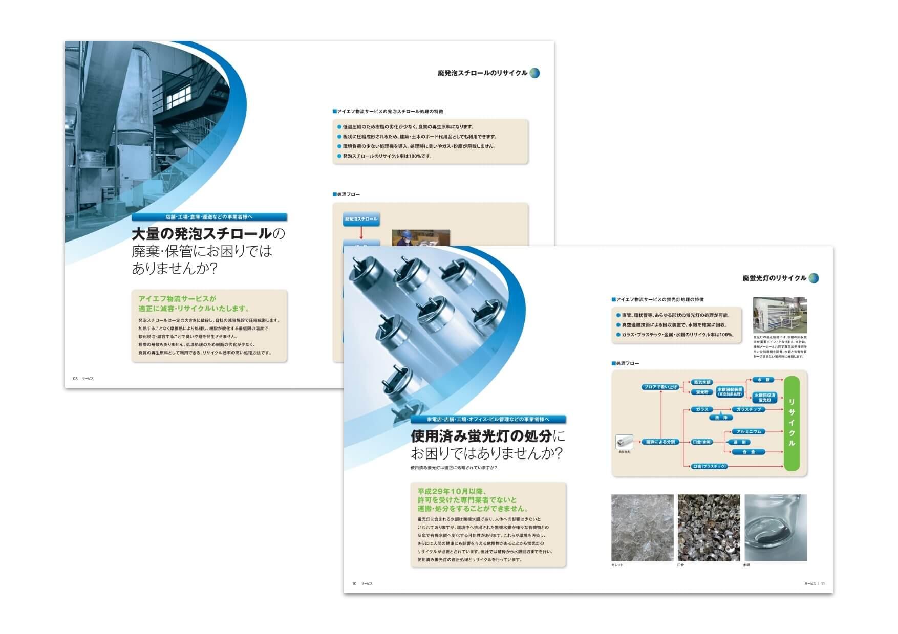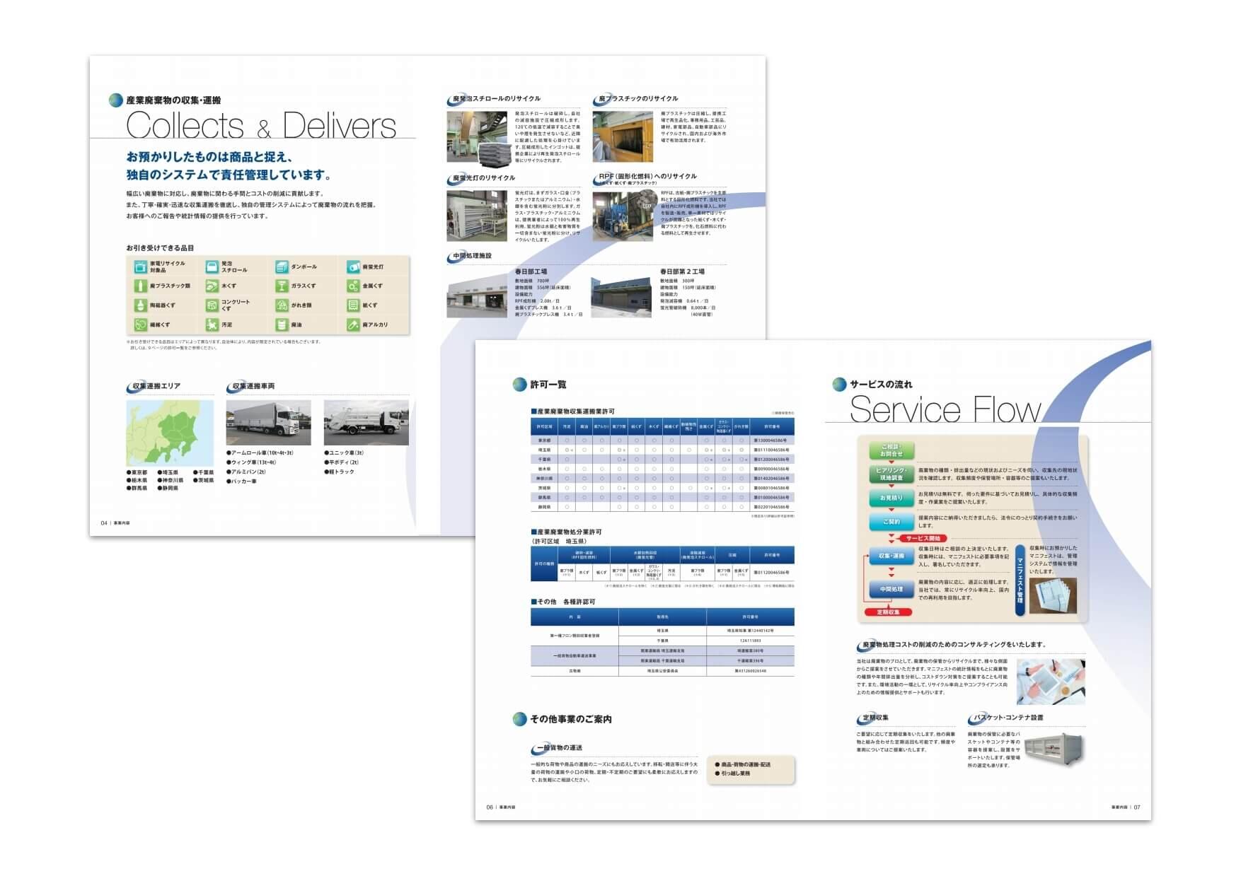 発泡スチロールやプラスチック、蛍光灯やハードディスクなど幅広い廃棄物の収集から処理、リサイクルを行う同社の会社案内パンフレットを作成。新規営業時に使用するためサービス全体をわかりやすく横断的に掲載。ブルーの曲線のメインビジュアルは地球環境への配慮とワンストップサービスの流れを表現しております。各サービスの紹介ではイメージ画像を大きく使い、処理フローを図式化することで直感的に伝わるようデザインしました。
