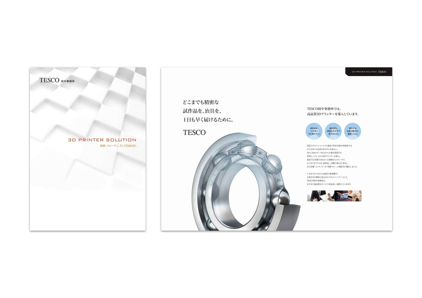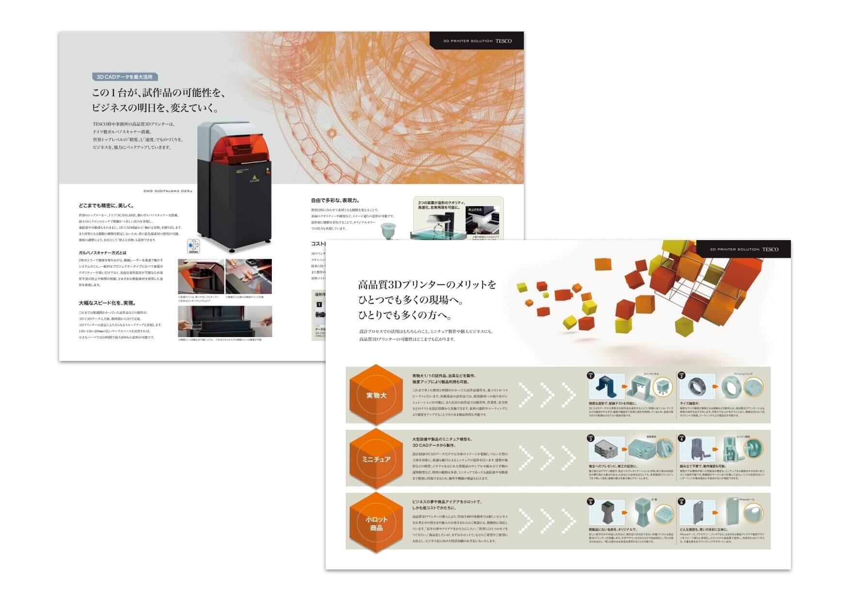 提案のベクトルは、3D CADに関わるスタッフ及びお客様以外の方が見ても分かりやすいバイブルのような会社案内パンフレットの作成。 サービス導入の経緯→導入したDWS(3Dプリンター)の優位性→実物大・ミニチュア・小ロッド商品などといった事例を複数の写真とコピーで紹介し、様々なニーズへの対応を促すペーパーツールとなりました。
