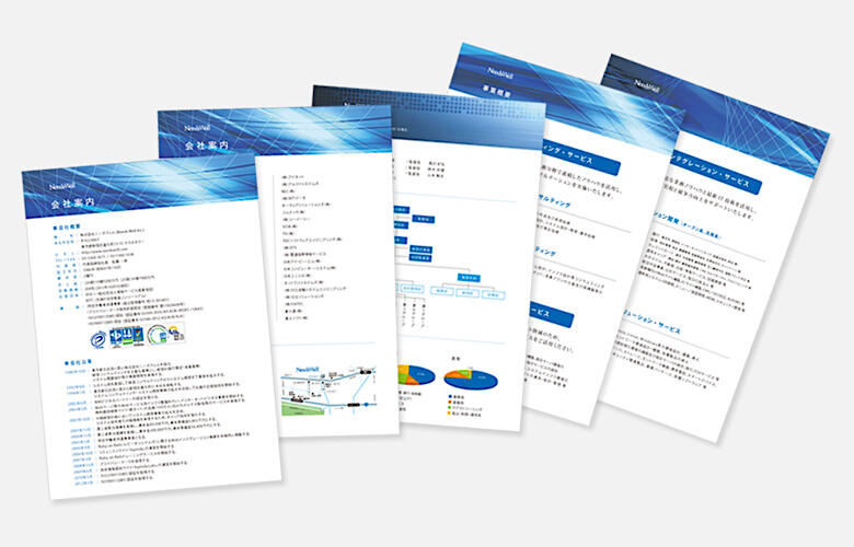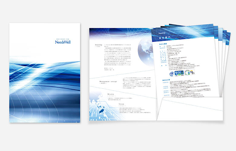 ITコンサルティングやシステムインテグレーションなど、システム構築を主たる業務を行う株式会社ニーズウェル様の会社案内パンフレット制作実績です。不変的な情報はポケットホルダー中面にレイアウトし、変更頻度の高い情報は、差し込み式の1枚ペラにて制作。ポケットホルダー・中差し共に、地球や幾何学模様をモチーフとしたグローバル感のあるデザインに仕上げています。