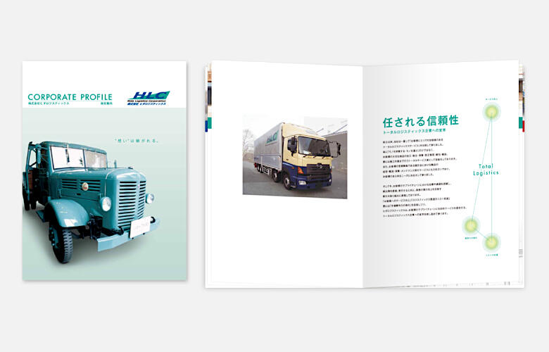 東京・千葉・神奈川・兵庫を拠点に配送や倉庫管理、製造ラインの受託業務など、流通業界で活躍する株式会社ヒダロジスティック様の会社案内パンフレット制作実績です。「創業当時の運搬車輌をデザインに取り入れたい」とのご要望を受け、表紙デザインは「想いは、継がれる。」のコピーと共にレトロな車両を掲載。歴史ある企業イメージを創出しています。シンプルに仕上げた紙面デザインは、とても好評です。