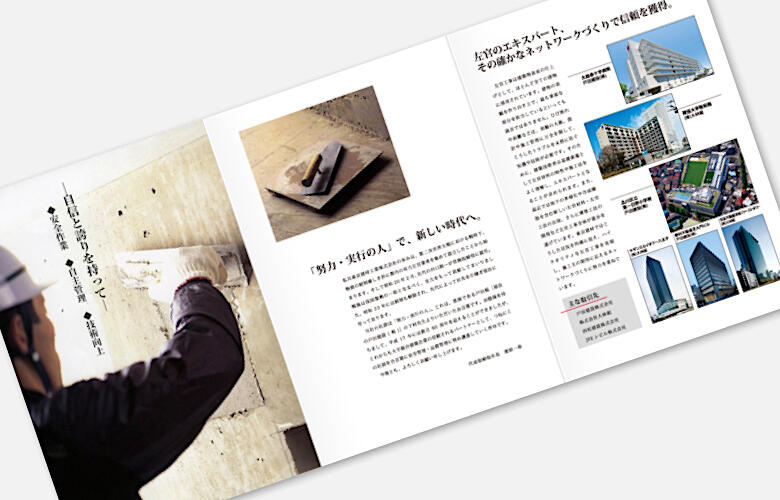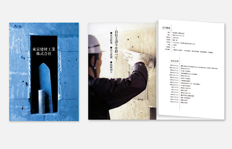 昭和20年創業の左官工事の老舗、東京建材工業株式会社。我国復興を目的に設立された同社は、古くから受け継がれる伝統の技術と現代の新技術の双方を有しており、その施工実績は他社を圧倒しています。左官業に特化した同社のブランドアイデンティティを具現化すべくご提案した今回の会社案内パンフレットは、ビジュアル訴求を機軸に、自社のプライドを具現化した会社案内パンフレットのデザインに仕上げています。