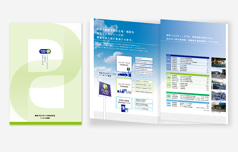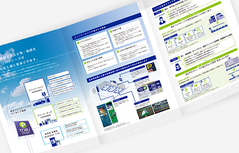東武沿線にてパーキングを運営・運用されている、東武プロパティーズ株式会社 パーキング事業部様の会社案内パンフレット制作実績です。表紙はごくシンプルにロゴとキャッチコピーが引き立つようにデザインし、中面については要点・メリットなどをわかりやすく短文にまとめました。会社案内パンフレット用に新たに描き起こしたシンプルなイラストで統一した紙面デザインと、背景に広がる青空の写真が、クリーンな企業ブランド像を醸成しています。