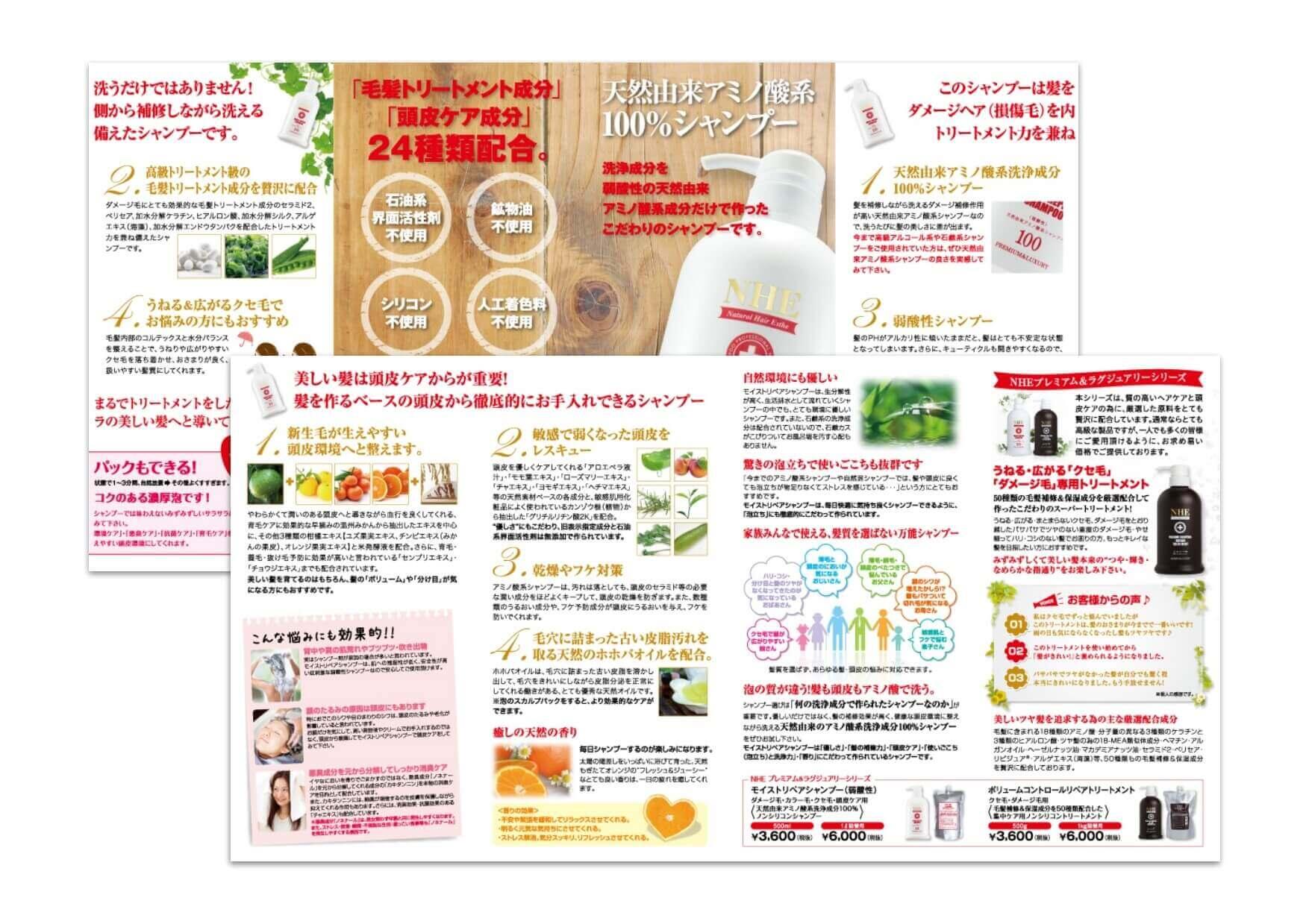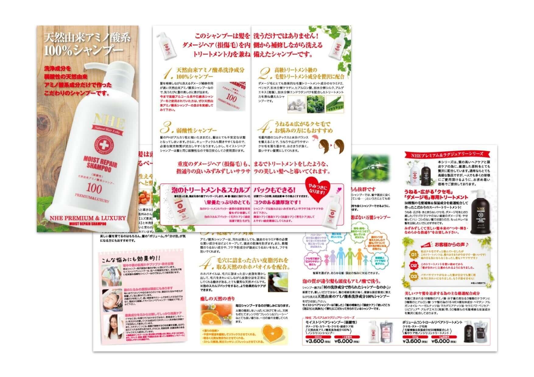 石油系界面活性剤、鉱物油、シリコン、人工着色料など、髪と頭皮に影響を及ぼす原材料を一切使用せず、こだわり抜いて作られたシャンプーがこのNHEモイストリペアシャンプー。本当の品質の良さを伝えるために、化粧品やヘアケア製品で行うイメージ訴求ではなく、しっかりと言葉で一つひとつ伝えるリーフレットを作成しました。効能を訴求するだけで紙面いっぱいの情報になりましたが、多くの情報でも項目毎にしっかりと余白を設け、見やすいデザインを心がけました。