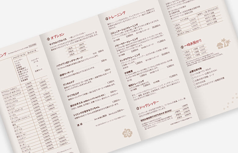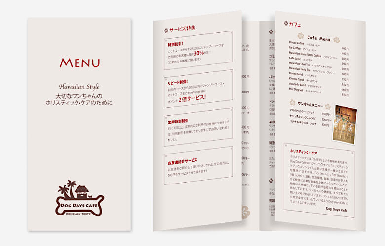 府中市内に店舗を構えるドッグデイズカフェは、トリミングサロン、ペットホテル、カフェ、トレーニング施設等を併設した、ペットの為のホリスティック・ケアサロン。ご来店頂いたお客様に、豊富なメニューをご理解頂くためのテイクアウト用リーフレットは、観音折り仕様の8面構成で制作し、多くの文字情報もすっきりと見やすくまとめ上げることで、シンプルかつ品格の高いデザインに仕上げています。