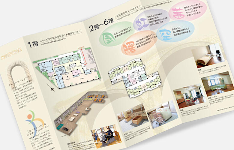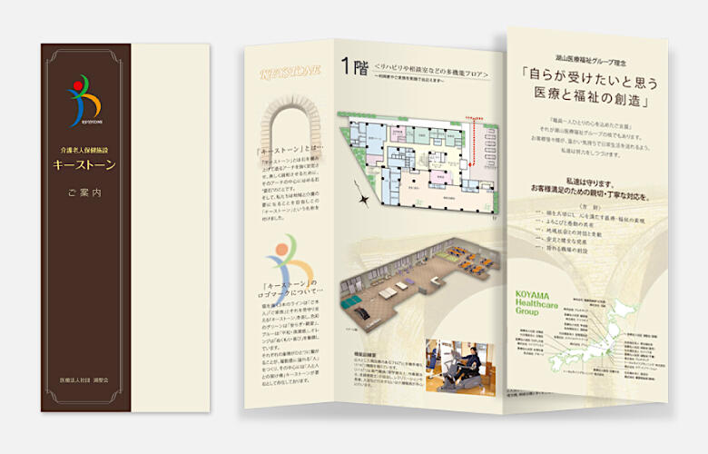 介護老人保健施設キーストーンは、「特別養護老人ホームカメリア」、「介護老人保健施設キーストーン」、「パークサイド亀島」の3施設が同敷地内に共立する、江戸川区初の複合福祉施設の一つとして誕生しました。竣工前の企画・計画段階から参画させて頂いた今回のプロジェクトでは、3施設のロゴデザインにはじまり、各ブランド展開の提案をさせて頂きました。介護老人保健施設キーストーンへのロゴ提案は、キーストーン(架け橋)の名にちなんで、“平和”“勇気”“心”の3つが交わり、人のシルエットを成すイメージを持って作成しました。また、リーフレットデザインは、同グループが理念として掲げる“自らが受けたいと思う医療と福祉の創造”を連想させるような、ダークブラウンの落ち着いた色合いが、上質な大人のサービスを連想させています。施設紹介部分では、各フロアに命名された「風、曙、虹、茜、空」のイメージをカラーチャートで具現化し、落ち着いた色合いながらも華やかさを感じさせるデザインに仕上げています。