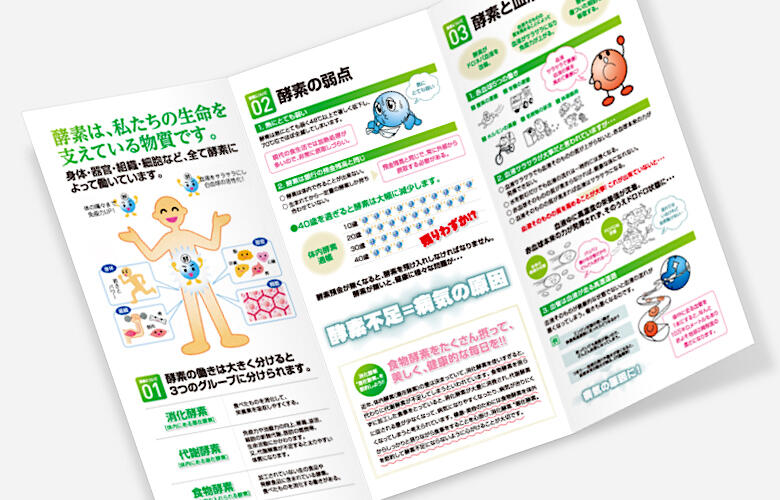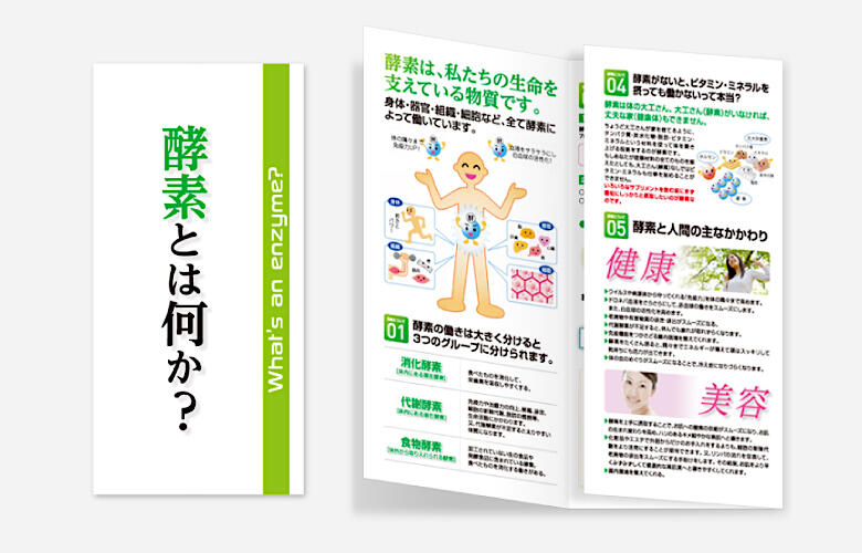 リーフレットタイトルは「酵素とは」。そのタイトル通り、営業色を一切排除した酵素を知って頂くためだけのリーフレット作成を行いました。あくまでもお客様への正しい情報提供を目的としたリーフレットであるため、シンプルに見やすくを念頭に、情報のレイアウトを行いました。