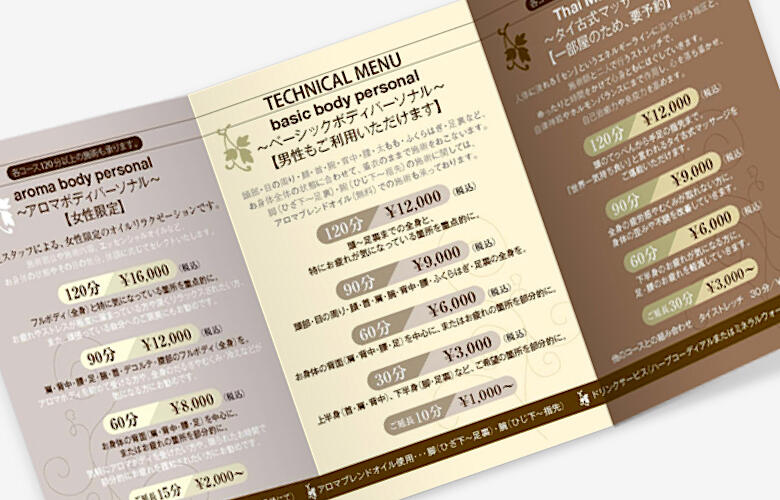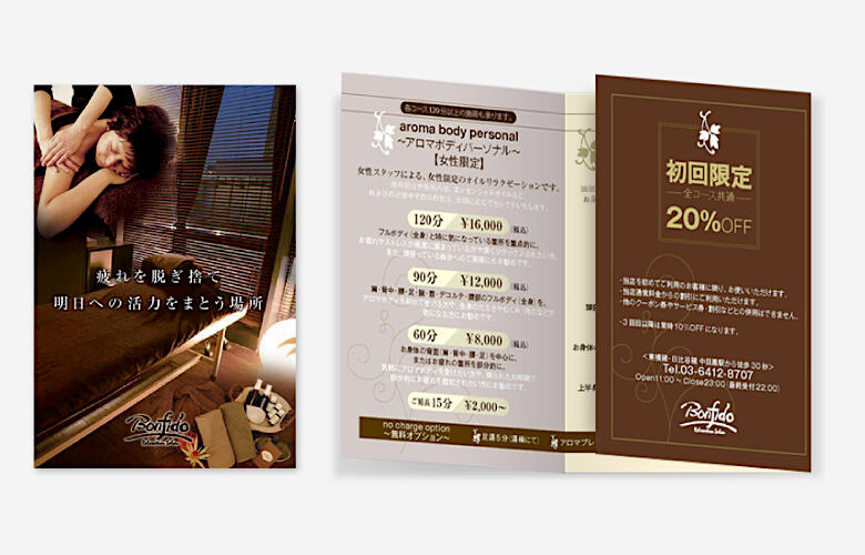 中目黒駅前でリラクゼーションサロンを運営するボンフィード。集客に向けたプロモーションツールのご相談を受け、名刺サイズのコンパクトなリーフレットを作成しました。表紙は施術イメージ、中折り面に割引クーポン、中面は巻三折り加工の特性を活かしたメニュー表、裏面は店舗情報・地図・電話番号など、小さいながらも必要な情報をきっちりと収めた無駄のないデザインで仕上げています。
