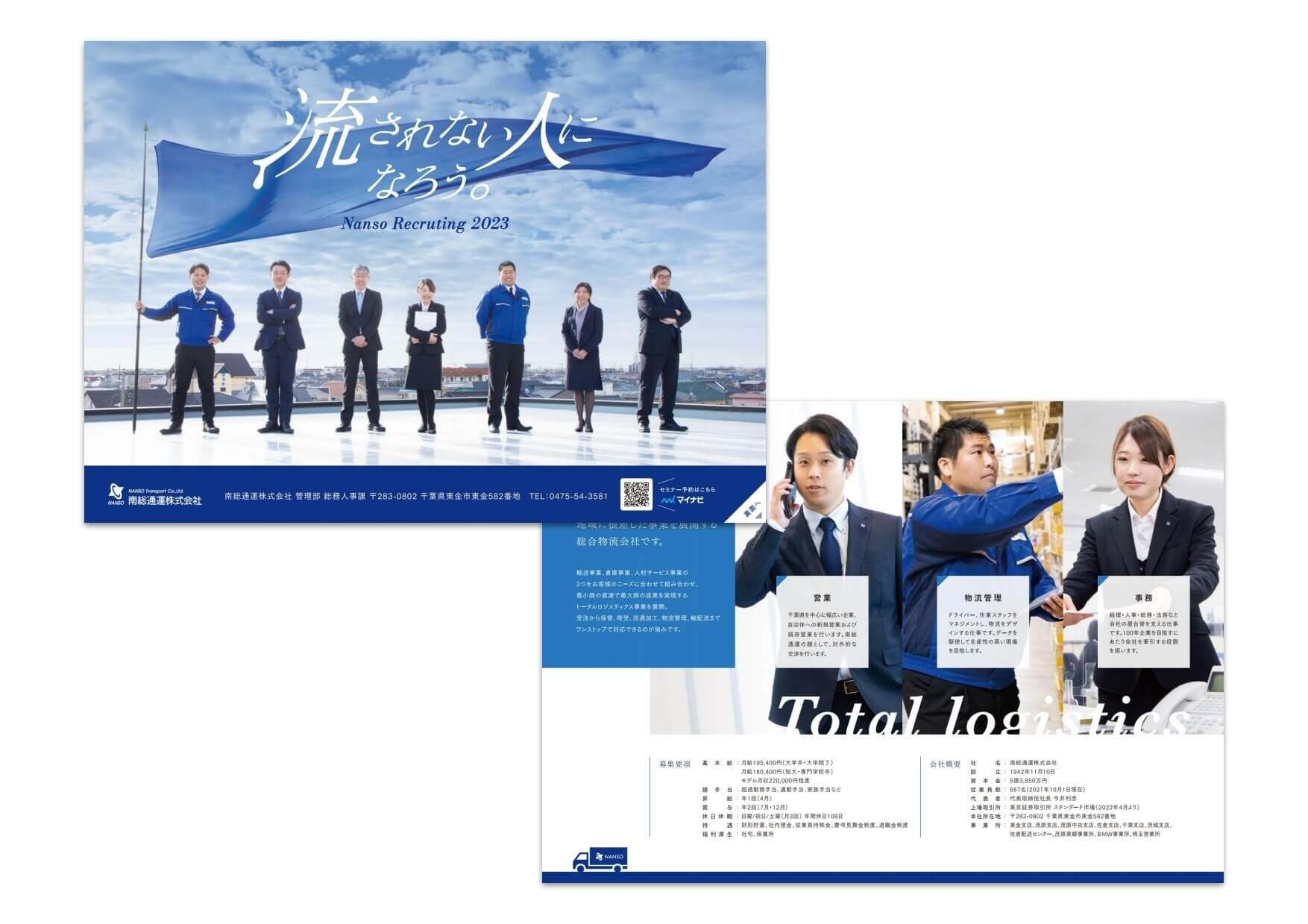 今回ご紹介させて頂くのは、「流されない人になろう。」の採用コンセプトの下制作した採用案内リーフレット。合同就職説明会で使用するばら撒きツールとして南総通運を広くアピールしていきます。