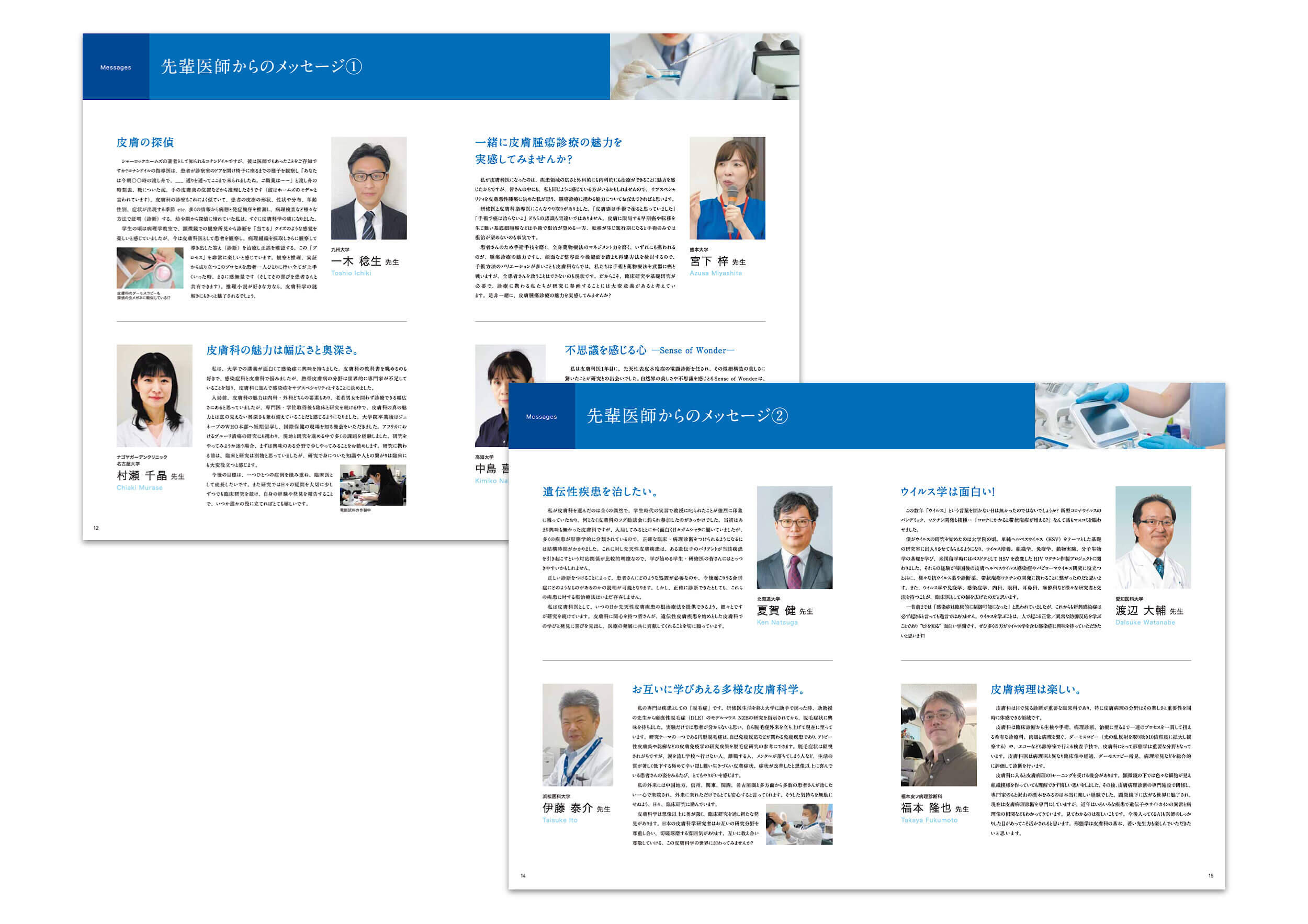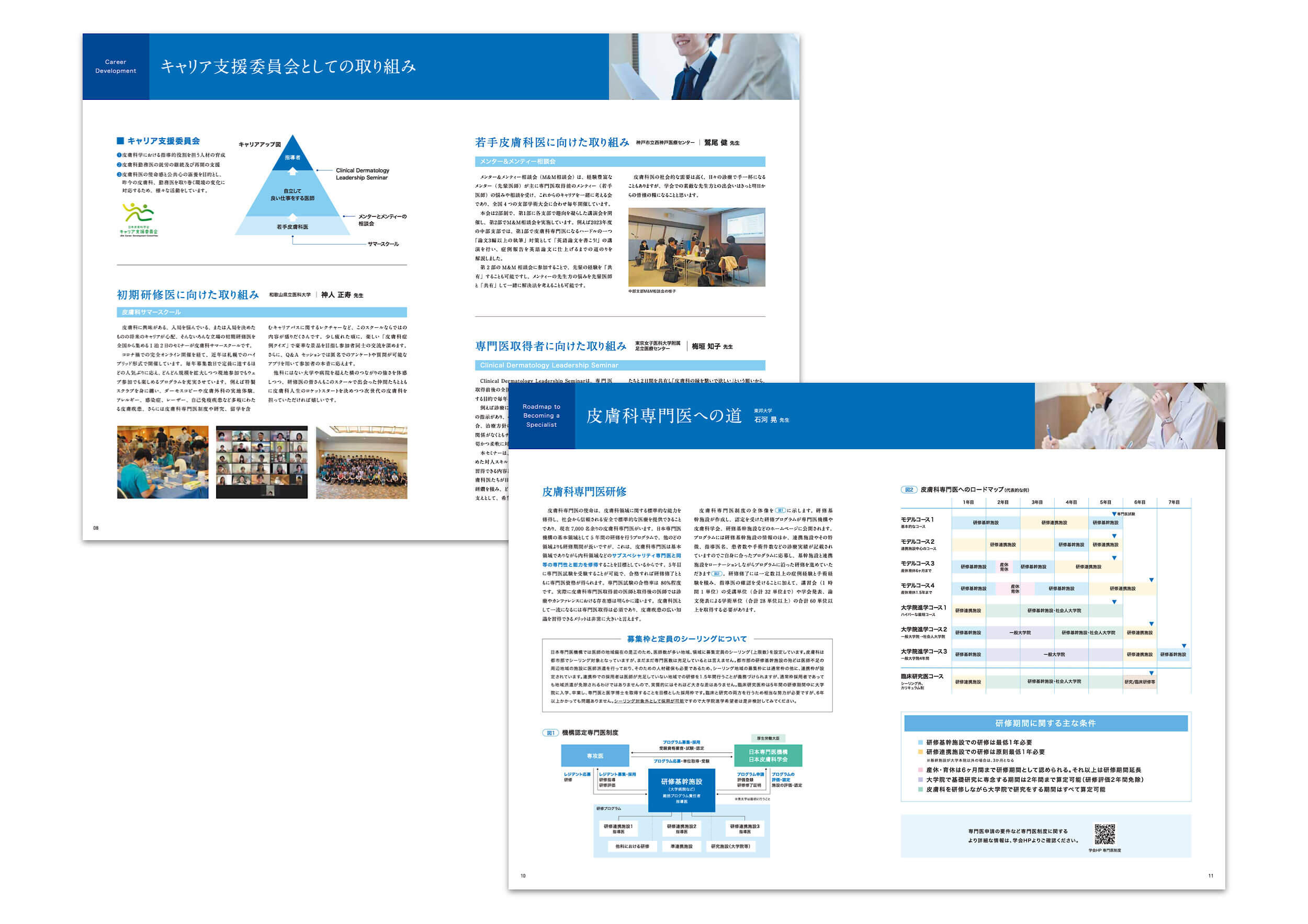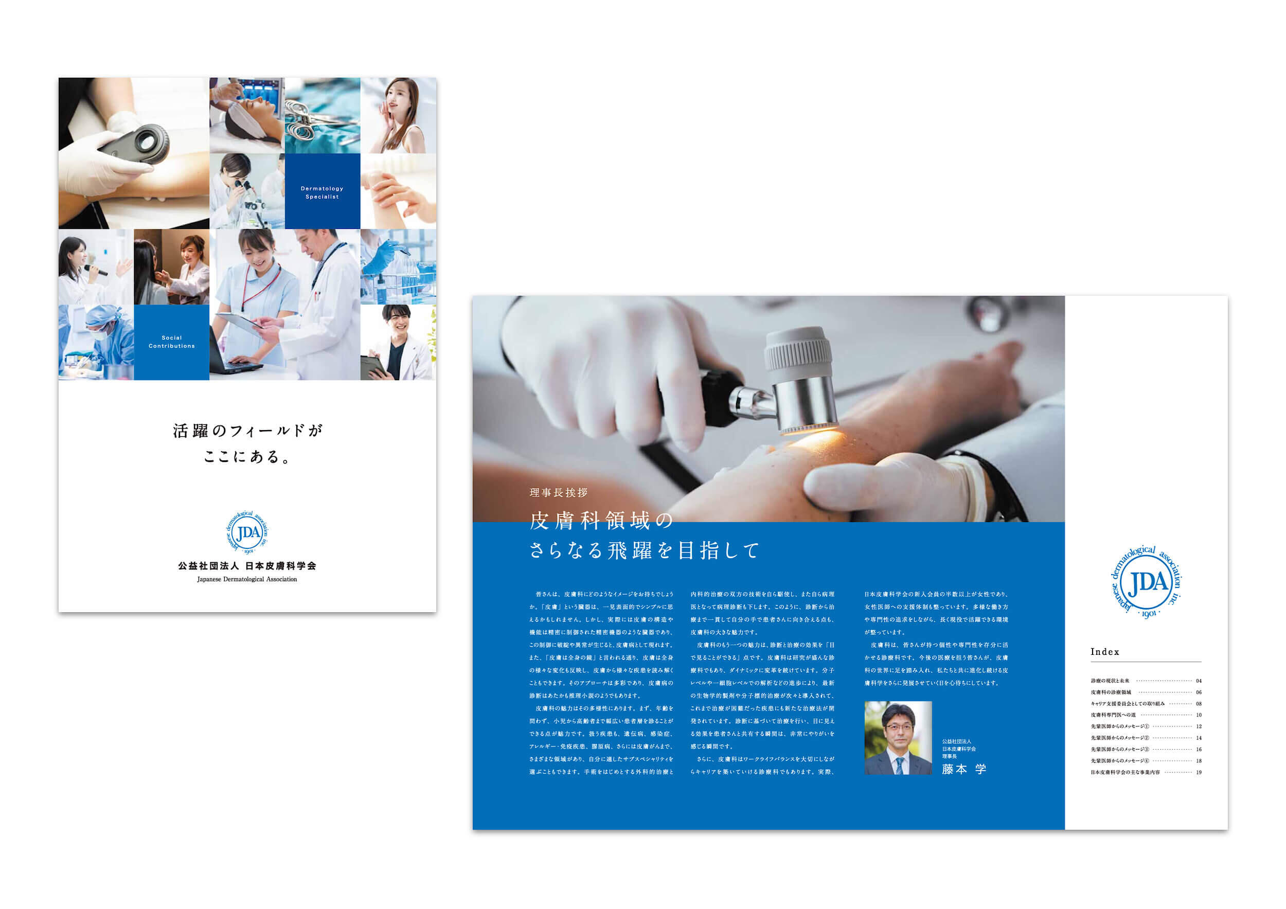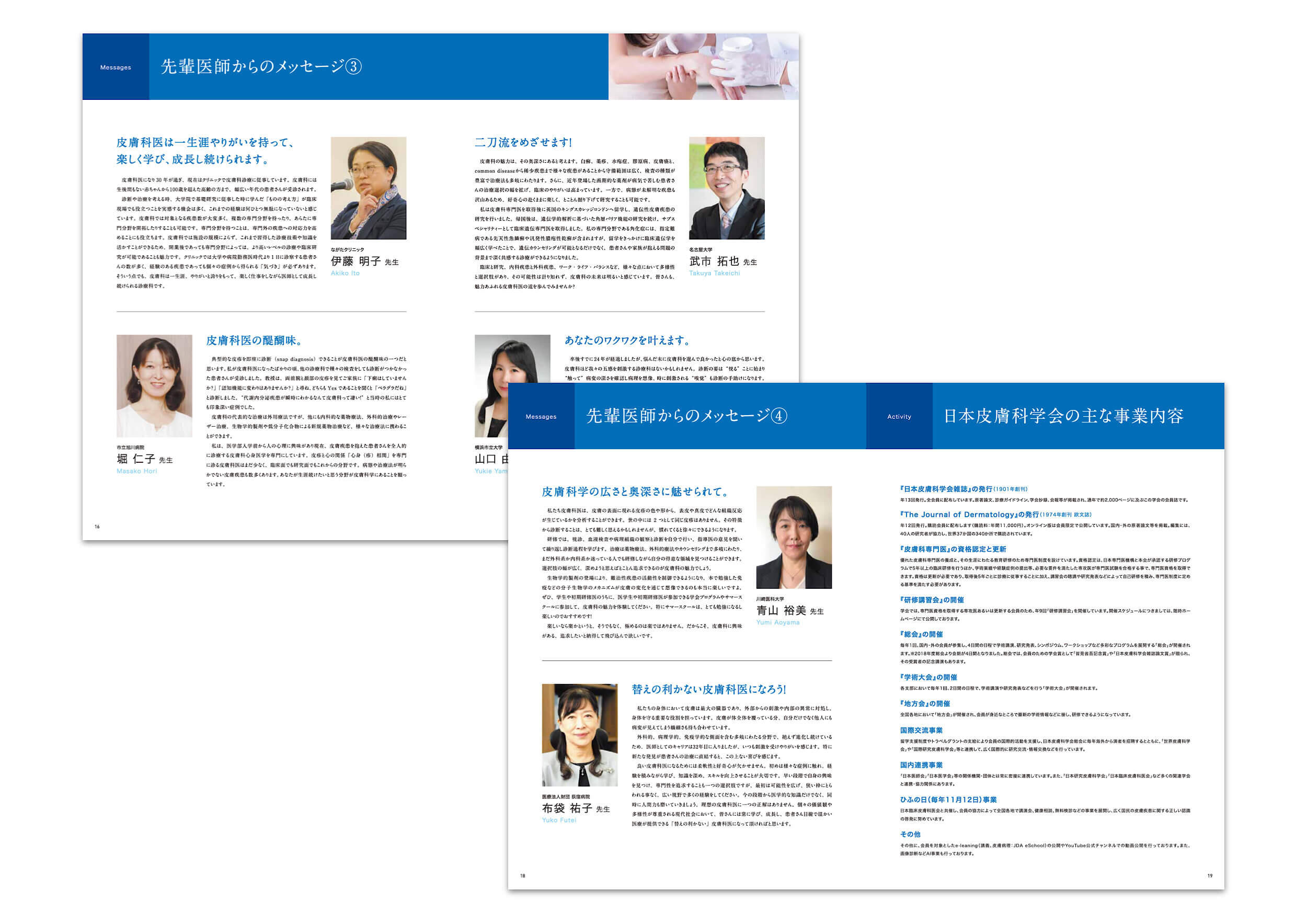 日本皮膚科学会様は、皮膚科学に関する研究・教育と医療について、連絡連携を図り、皮膚科学の進歩・普及に貢献し、学術文化の発展に寄与することを目的として全国各地 約1万人の会員により組織されている社団法人。医師を目指す方々に向けて皮膚科の魅力を伝えることで、皮膚科学の推進・発展を図る日本皮膚科学会 入会案内パンフレット作成のご依頼を賜りました。前半では皮膚科診療の現状と未来、診療領域、キャリア支援委員会の取り組み、皮膚科専門医へのロードマップなどに触れ、皮膚科専門医の未来が拓けている情報を開示し、後半では皮膚科専門医としてのやりがいや楽しみなどを先輩医師からのメッセージとして伝えています。テキスト情報量が多いため、極力装飾を省きスッキリと仕上げることで可読性を担保しつつ、要所を図解や画像で補足。情報とメッセージをしっかりと区分することで、皮膚科の魅力が伝わるパンフレットに仕上げました。