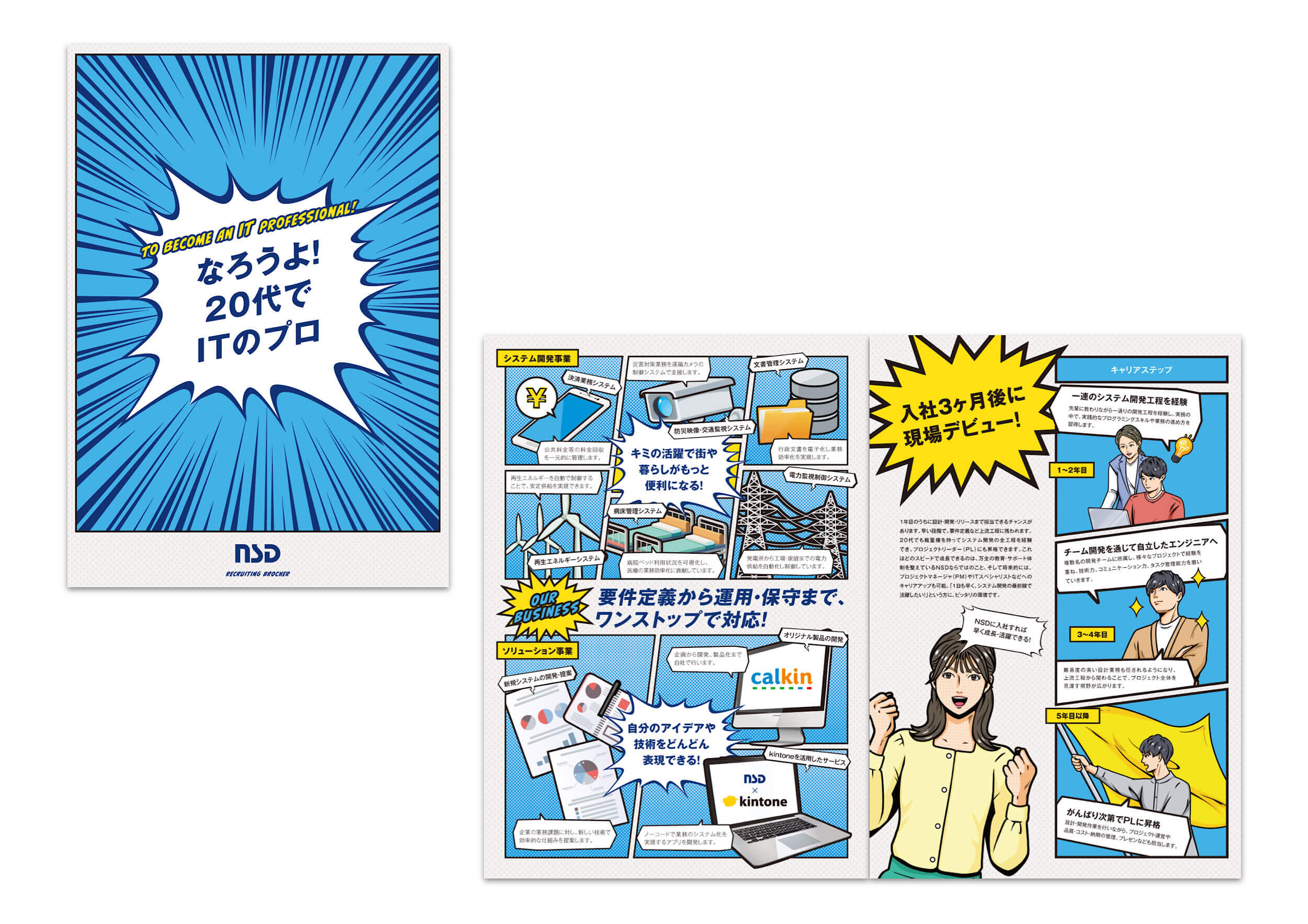 採用活動強化に向けた採用案内パンフレット制作実績です。若くしてプロフェッショナルを目指せる充実の研修制度とキャリアステップ、やりがいのある業務内容、働きやすい環境まで、エヌ・エス・ディの魅力を余すことなく掲載。ご要望いただいた既存Webサイトのアメコミテイストを活かしながらも、企業風土や在職スタッフとのギャップが生じないよう細部にまで配慮し、採用案内をコミカライズしたデザインに仕上げています。