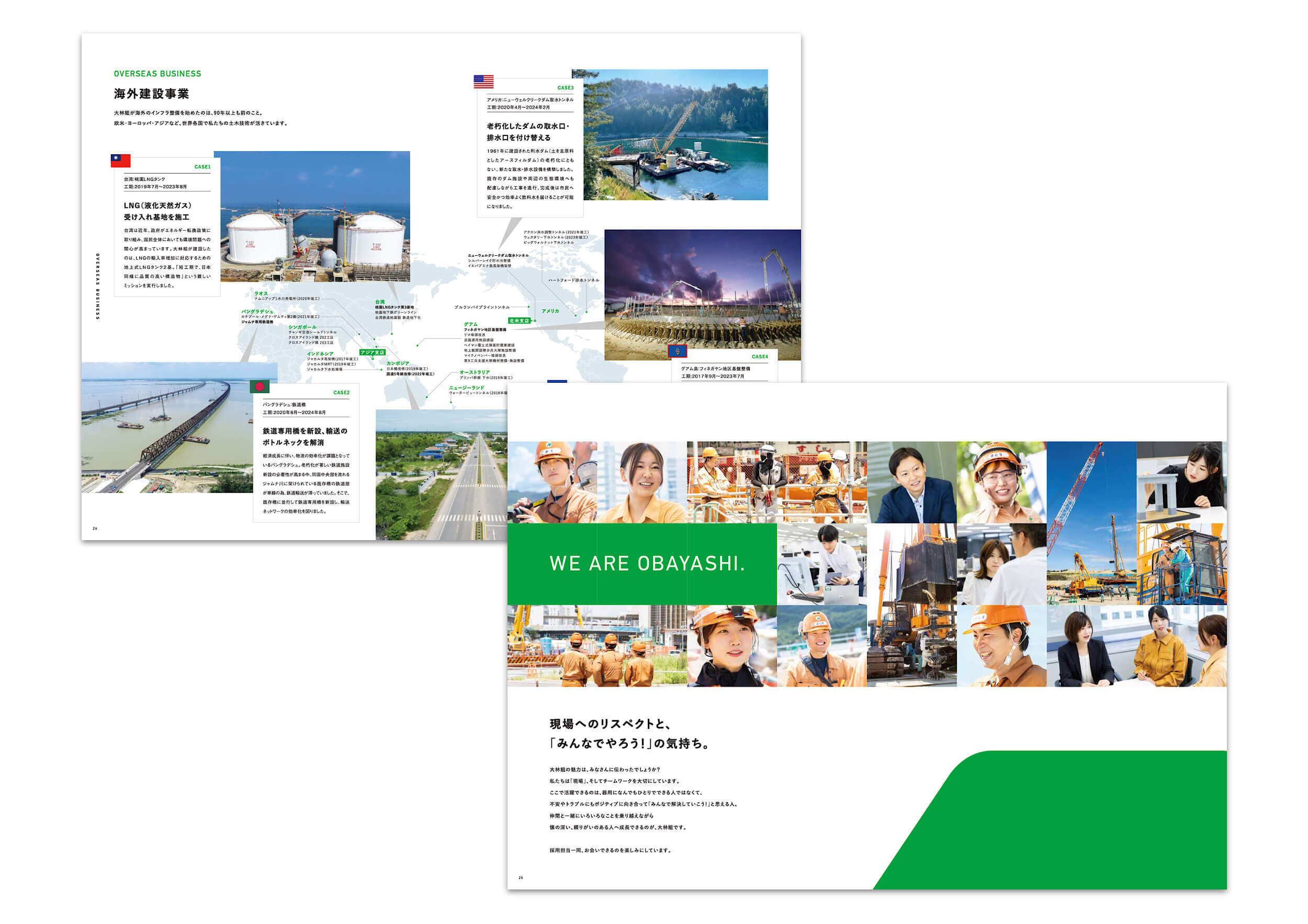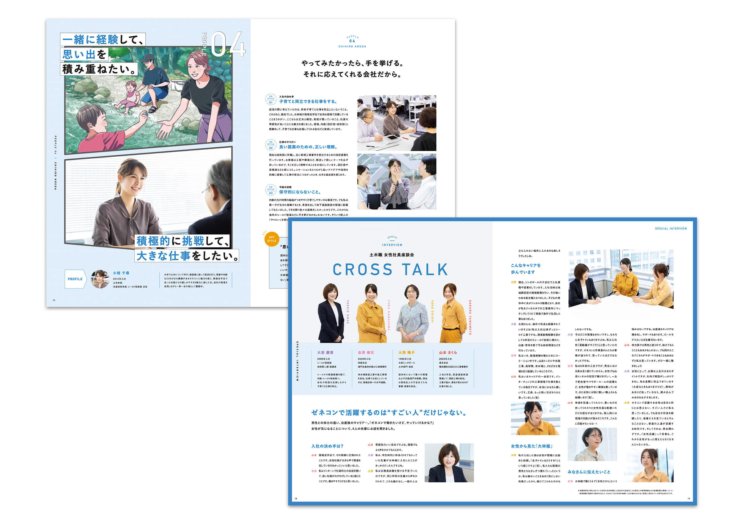 そこで今回の採用パンフレットのコンセプトを「OBAYASHI PEOPLE」に設定。めざしたのは、社員のオンとオフを取材し伝えることで、その社員の人柄はもちろん背景(同僚や先輩、家族)や豊かな人生までも感じ取れるパンフレット。オフのシーンは取材の上イラストを描き起こし、自分の趣味に没頭する・子どもたちと遊ぶ・恋人とデートをするなど、その人らしい時間の使い方を表すことを大切にしました。「日本のインフラを支えるスケールの大きな仕事をしている人は、自分と同じ普通の人」というイメージを訴求し、学生の背中を押すパンフレットに仕上げています。