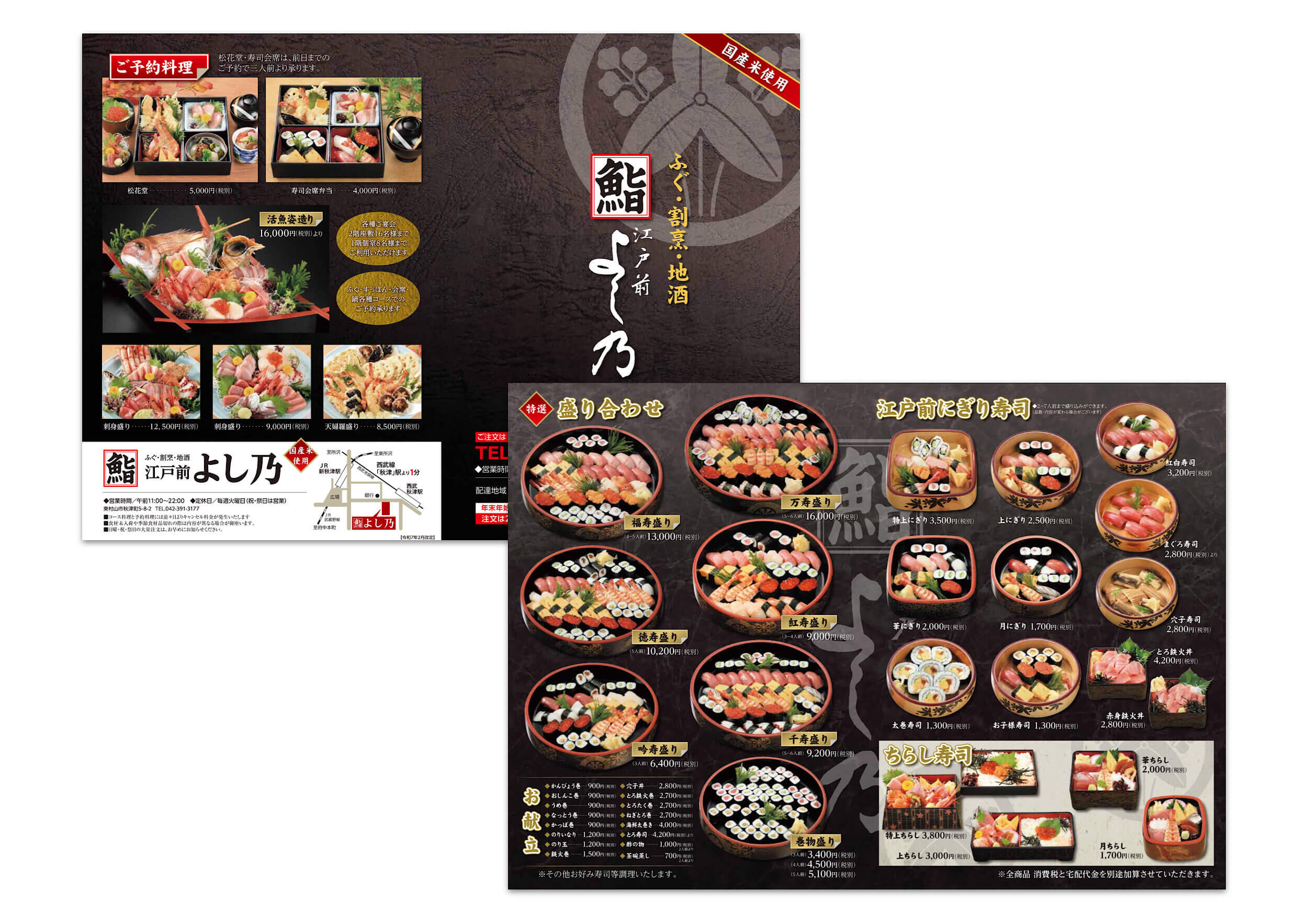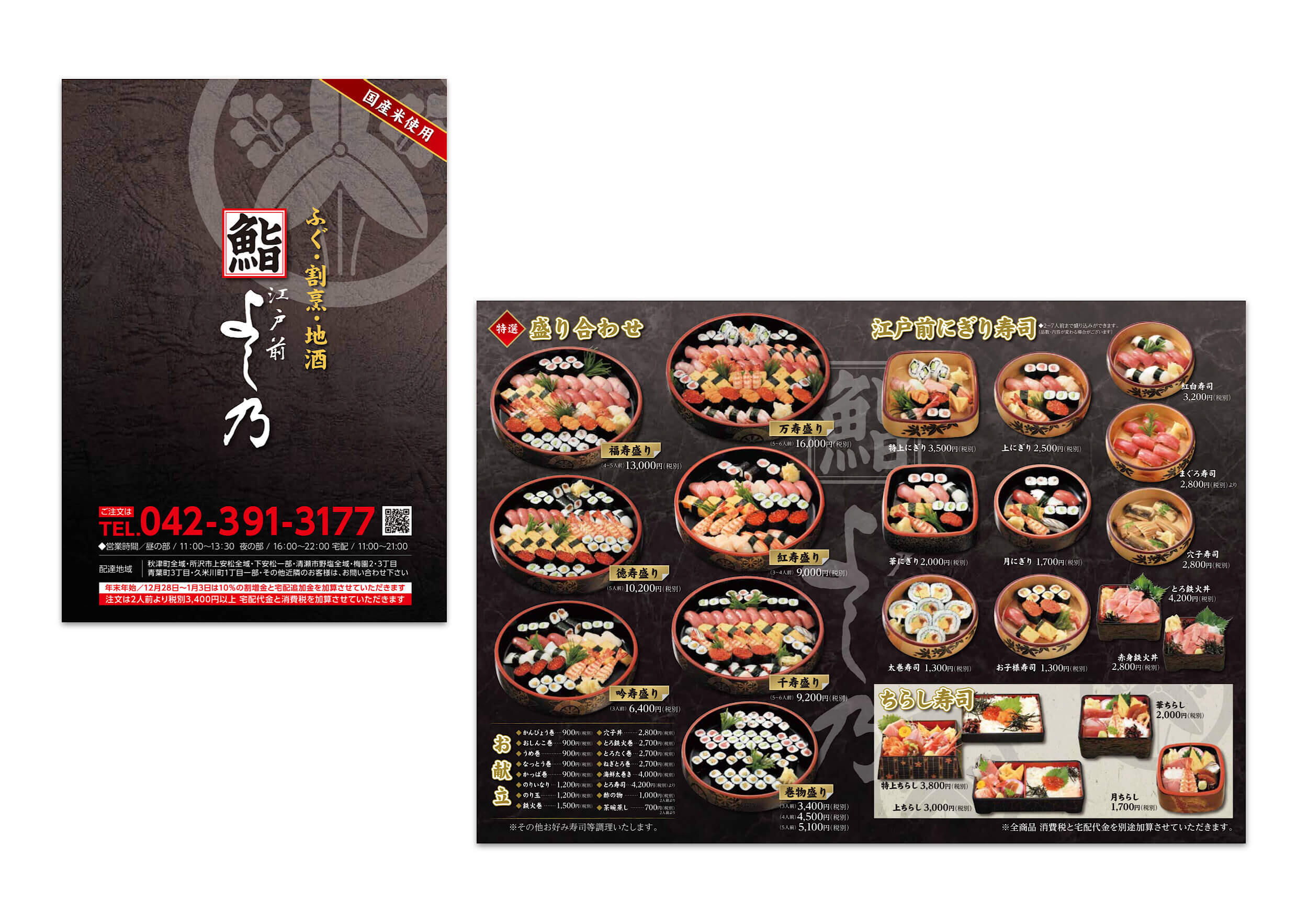 素材の旨みを最大限に引き出す鮨職人の技と、肩肘張らずに味わえる温もりある接客。それらが共存する「鮨よし乃」様の魅力を、メニューパンフレットのビジュアル構成にも反映させました。表紙には上質な質感と余白を活かしたデザインを採用し、料理の写真は光と影のコントラストを強調することで、品格と食欲を同時に喚起する表現に。情報面では、来店客が知りたい内容に素早くアクセスできる構成とし、紙面に載せる料理名・価格・説明のバランスにもこだわりました。視覚的な美しさと実用性を両立した、ブランディングの一環となるメニューパンフレットに仕上げています。