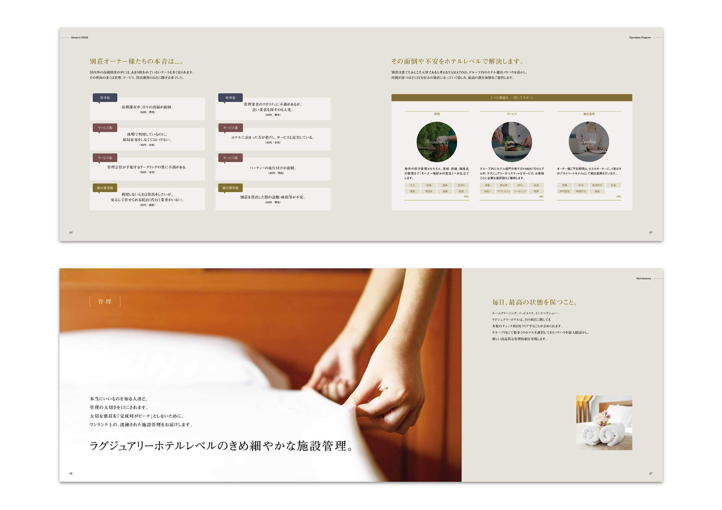 また、葉山、軽井沢、沖縄、杭州、ホノルル、マルベラといった国内外のリゾート地に展開する拠点構想や、無人オペレーションによるスマートな運営体制も紹介。さらに、土地探しから設計・施工、貸出管理、売却計画までを一貫して支援する“オーナーズマネージャー”の存在も明示し、理想のホテルを持ち、自在に活用する未来の暮らし方を描いています。