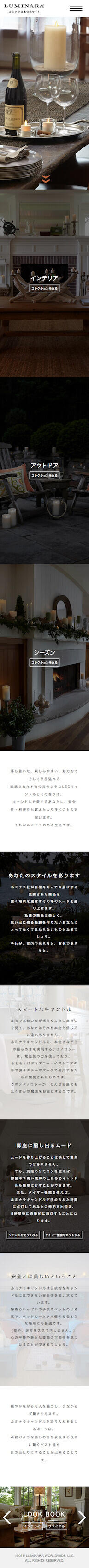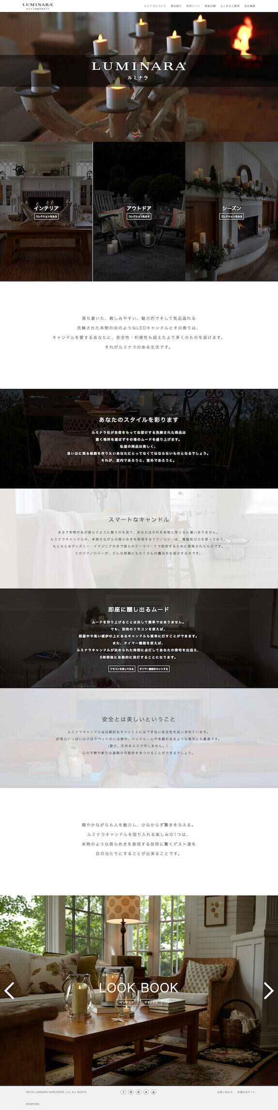 アロマキャンドルの香りとLED照明の安全性を兼ね備えた、LEDキャンドル「LUMINARA」。洗練された本物の炎のような灯りと、その香りが伝わるUIを目指し、デザイン提案させて頂きました。キービジュアルには、インテリアと組み合わせた際のイメージがより伝わるよう、動画・映像を配置。スクロールするごとに表示されるパララックス・エフェクトと併せ、ユーザーを飽きさせない工夫を行っています。フルブラウザの縦スクロールで構築されたサイトデザインで、ユーザーをLUMINARAの世界へと誘います。
