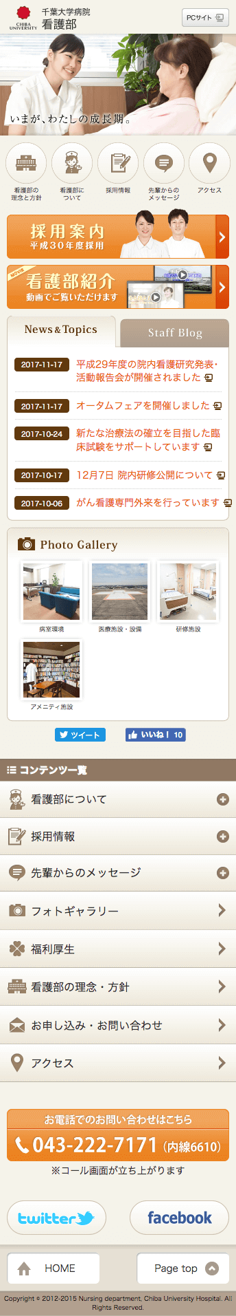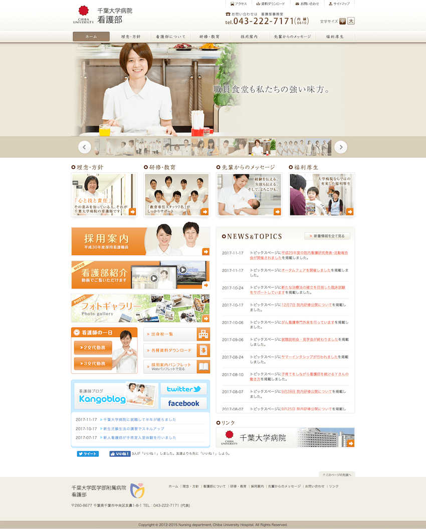 看護師の採用強化おいて、最重要項目に位置付けられる採用案内サイト。質の高い看護職員の採用に向け、まずは応募数を増加し、採用の母集団を形成することを目標に、「広く、深く、もれなく」をテーマに掲げサイト設計を行いました。コンテンツ開発では、国立の大学病院として社会的使命に掲げる、看護の質の向上に向けた教育に関する情報発信に特に注力したページ展開を行っています。千葉県内及び全国の医療機関の看護師教育レベル向上に寄与できるよう、研修・教育項目をフルオープンした充実の採用案内サイトに仕上げています。