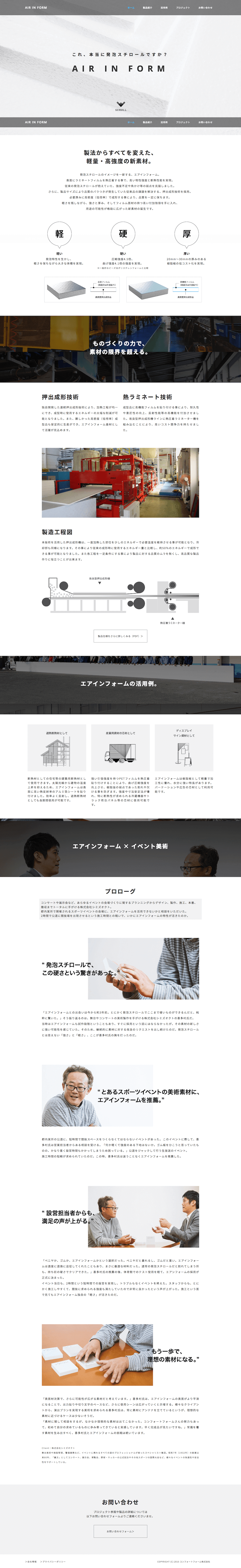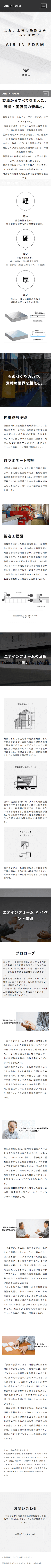 通常のブランドLPでは、いかに「モノ」の良さを表現し、ユーザーへ伝えられるかが重要視される事が多いですが、このエアインフォームではモノの良さの伝達は担保しつつも、新素材の可能性を表現する「コト」にも重点を置きました。販路拡大のアプローチ自体をコンテンツ化・レポートとしてWeb上で発信していくプロジェクトをコンテツとして設け、新規顧客拡大の導線となるようなサイト設計に致しました。