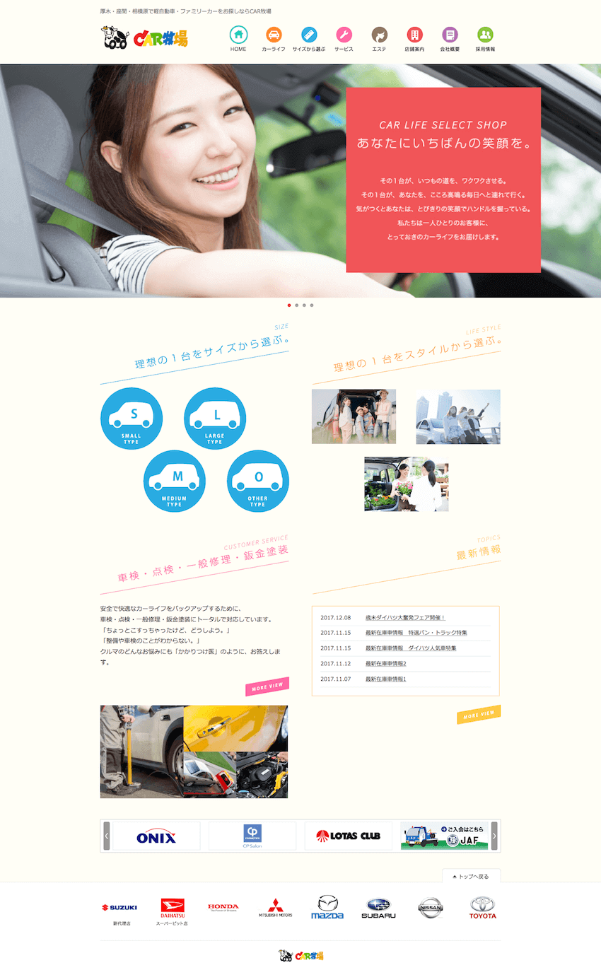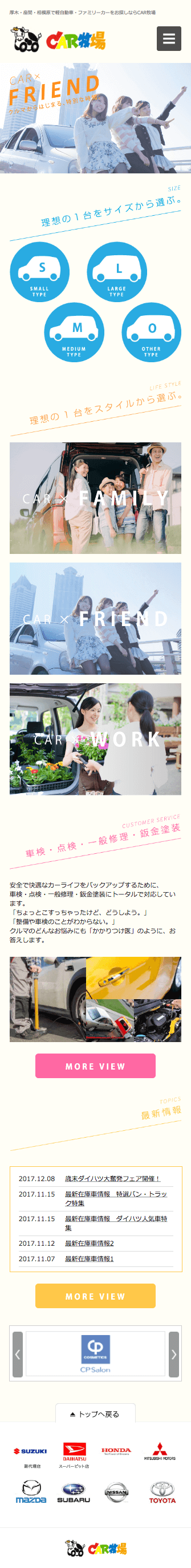 厚木・座間・相模原で軽自動車・ファミリーカーの販売を手がけるCAR牧場。国産全メーカーの新車・中古車販売を中心に、車検・点検・整備業務、板金塗装業務、損害保険代理店業務など、自動車に関わる関連事業を包括的に手がけています。1984年の創業より着実に信頼と実績を積み重ね、地域に欠かせない自動車販売店となっています。