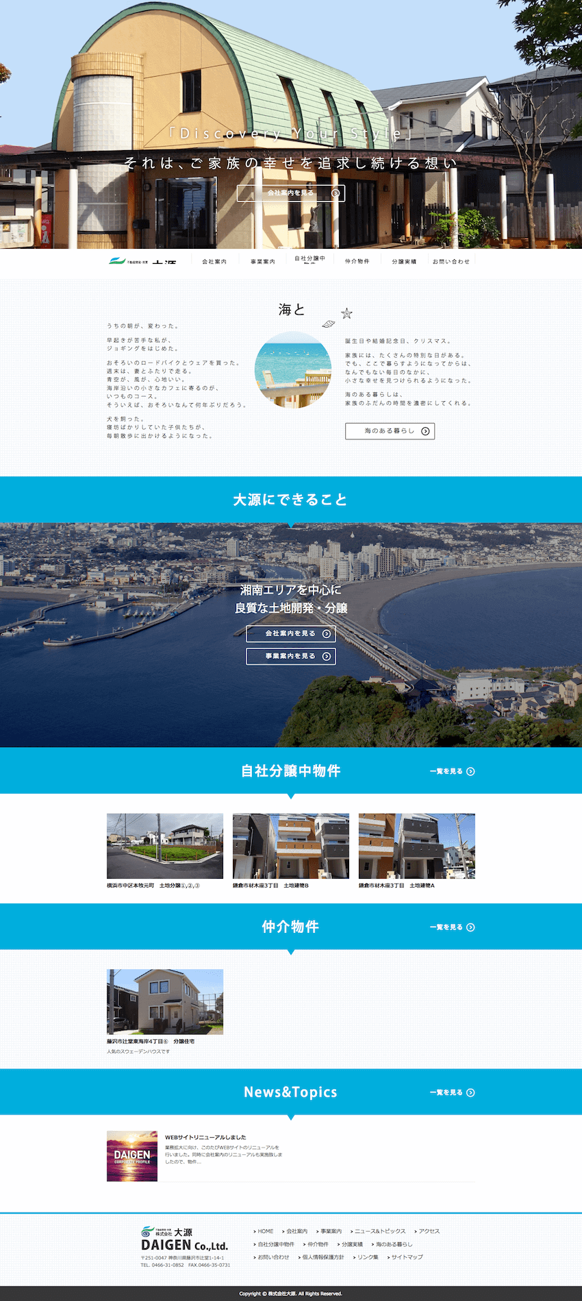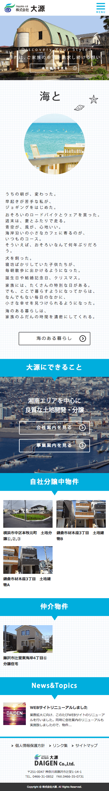 1977年の創業より、湘南エリアで「海のある暮らし」を提案し続けてきた大源。どこよりも地元・湘南を愛する不動産会社として、長年にわたり不動産事業を通して地域活性化に貢献している。宅地開発を中核に、建売事業、コインパーキング事業、アパート・マンション運営、テナントリーシング、物件管理などの不動産事業を行っている。