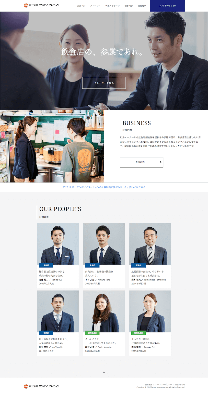 新卒採用サイトの設計において、ベースとなるコンテンツを置くだけでは、不動産という枠を超えた、意義のある仕事であることを伝えきれません。そこでストーリー仕立てで、現場の様子を紹介することで独自のビジネスモデルを直感的に伝わるようなコンテンツをファーストビューエリアに設置いたしました。緊張感のあるコピーに沿うような直線的なデザインの中にも有機的なアニメーションを実装致しました。