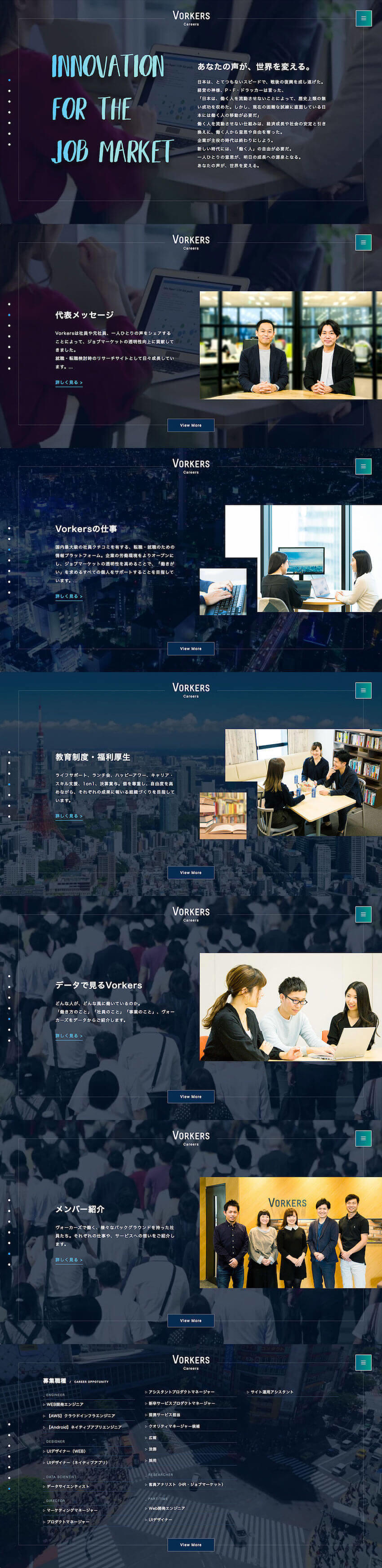 自由な社風、働きやすい環境、明るいオフィスなど、ヴォーカーズの魅力を伝える採用サイトを制作しました。Keyビジュアル背景には「働くこと」を想起させる動画を配し、動きのあるデザインに。また、情報コンテンツの一つひとつを丁寧に、アイコンなども加えながらシンプルにデザインすることで、直感的に情報の伝わる、求職者目線の採用サイトに仕上げています。