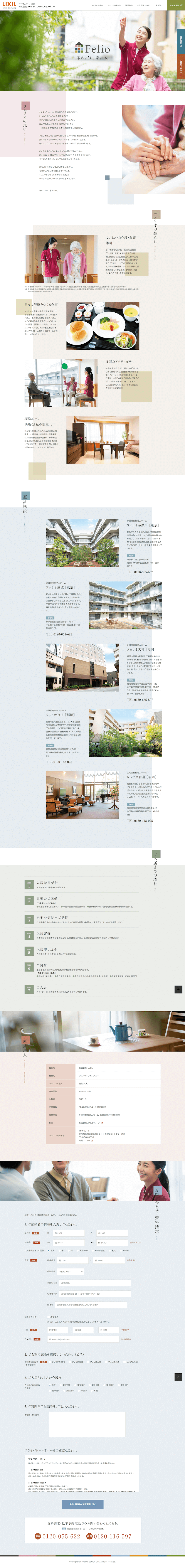 住まいと暮らしのトップ5ブランドが合併した「株式会社LIXIL」が運営するシニア事業部門。総合住生活企業としてのトータルな力を活かし、介護付有料老人ホーム「フェリオ」や住宅型有料老人ホーム「レジアス」の運営を行っています。