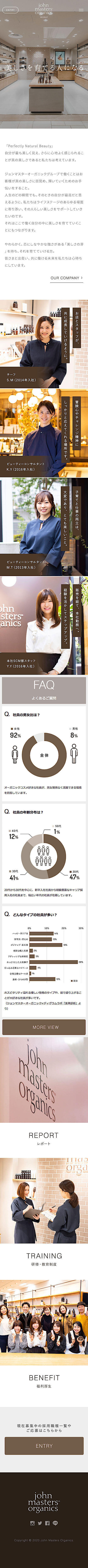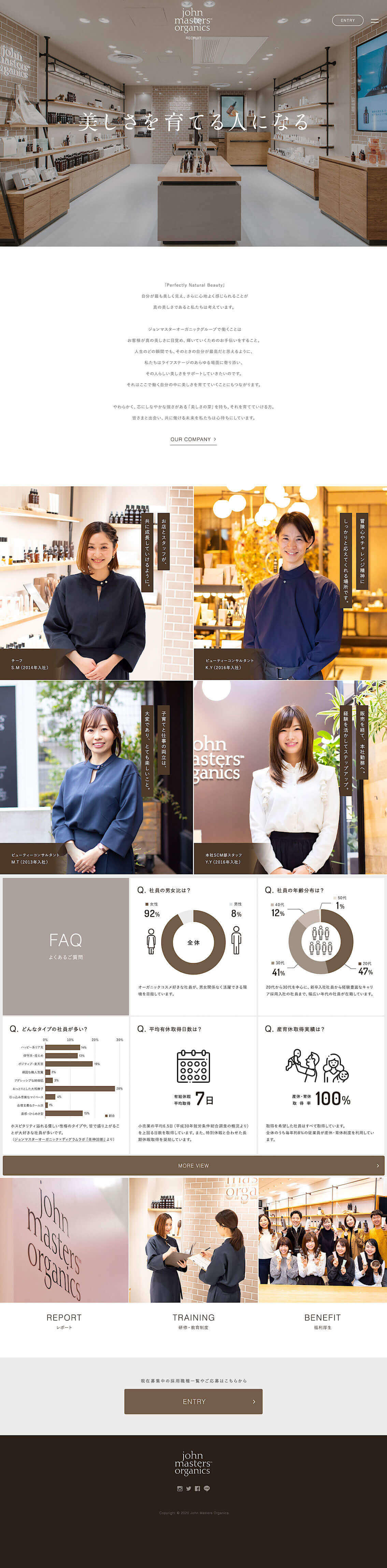 店舗スタッフの採用を強化したいというご要望のもと、TOPページのファーストビューで実際に働くスタッフの姿をmovieで紹介。スタッフの自然で美しい表情をBRANDNESSのひとつとして表現しました。デザインのトーン&マナーは同社における最新のブランドイメージを踏まえ、さらにECサイトとも統一性をもたせてジョンマスターオーガニックらしさを感じられるUI設計を行っています。また、求職者が知りたいことをインフォグラフィックで視覚的に表現するコンテンツを設け、応募へのモチベーションを高める効果をねらいました。