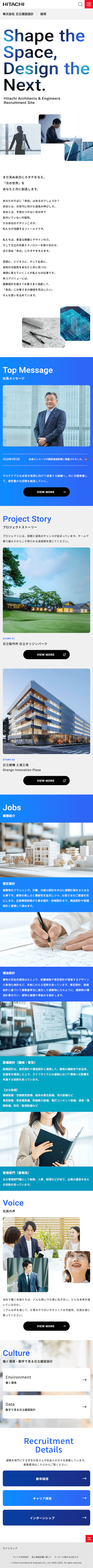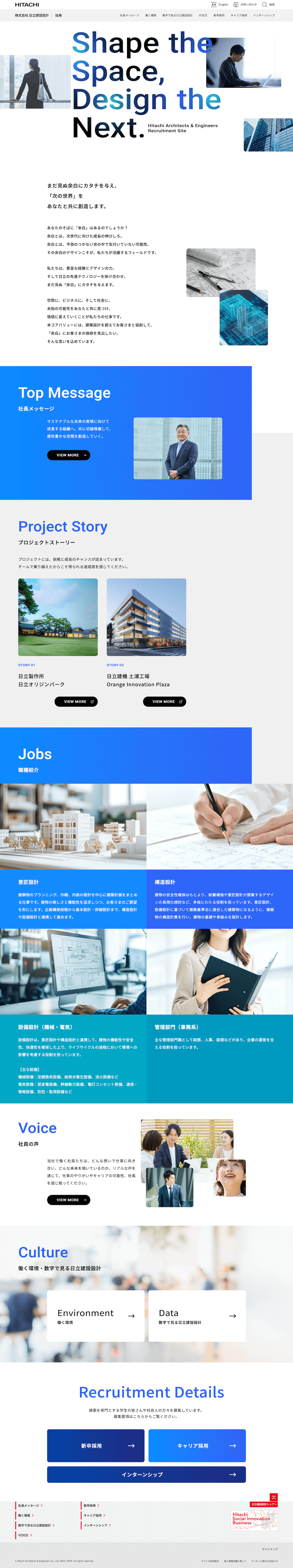 日立グループの建設設計会社である株式会社日立建設設計の採用サイトを制作しました。従来はコーポレートサイトの採用情報として募集要項や社員の声のみの掲載でしたが、このたび採用応募を促進するためコンテンツを拡充し、マイクロサイトとしてリニューアルしました。トップには「Shape the Space, Design the Next」という同社が大切にするコアバリューを掲げ、見る人の想像がふくらむ“余白”を設けたデザインに。社長メッセージ、プロジェクトストーリー、職種紹介、働く環境、数字で見るといったコンテンツを追加し、仕事内容や社風・働き方を伝える情報を充実させました。また、従来からあった社員の声はフォーマットデザインに落とし込むとともに、検索機能を追加。新卒採用、キャリア採用のどちらも対象としたサイトのため、入社区分や職種でソートすることで、自分の状況に近い社員の声を読むことができように工夫しました。同社の魅力がつまった採用サイトに仕上がりました。