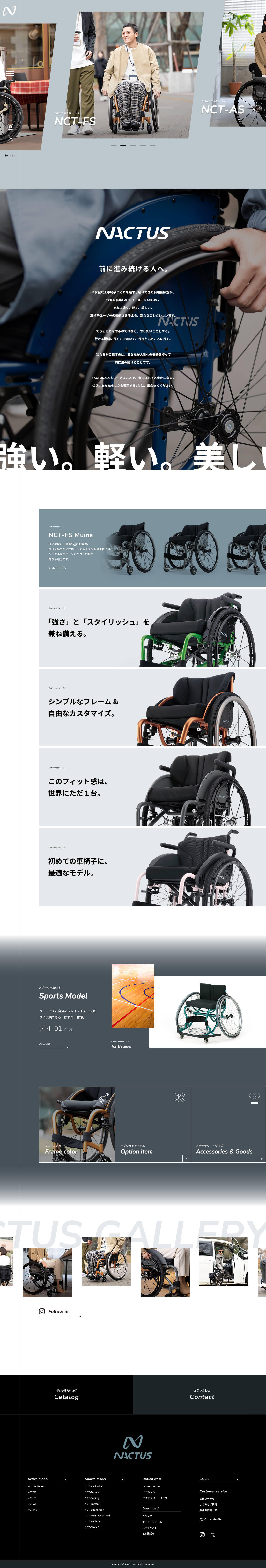 車いす市場で高いシェアを誇る日進医療器様が、上半身を自由に使えるユーザーをターゲットとした5種の「アクティブ車いす」を開発。製品ブランディングのご依頼をいただき、ネーミング開発から携わりました。業界での知名度が高い日進医療器様のNを入れ、積極的に毎日を楽しむユーザー像を想起させるブランドネーム「NACTUS」をご提案。スタイリッシュなキービジュアルによるポスタ−を制作し、展示会での露出直後から注目を集めることをねらいました。